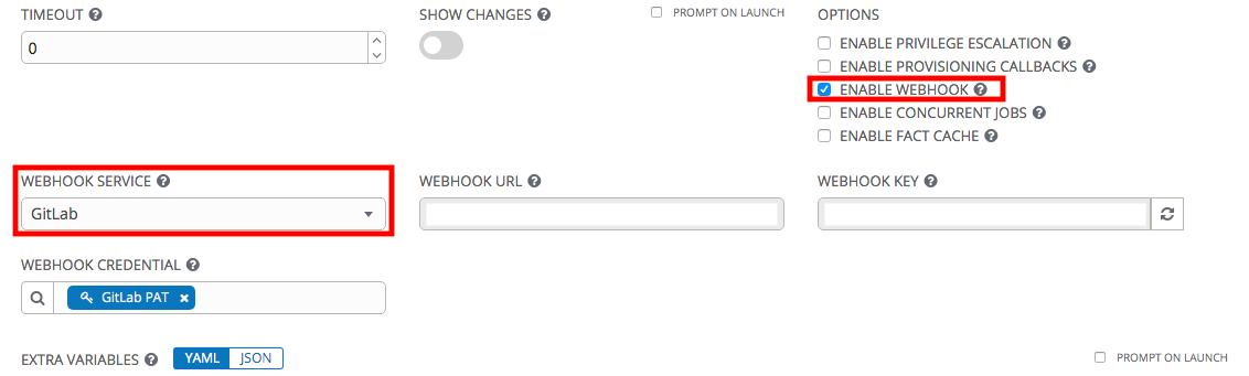 マニュアルにある通りGitLabの設定をしたら、Webhookを使用してジョブテンプレートを実行することができます。しかし、AWXのプロジェクトをWebhookで実行することはできないようです。上記のジョブテンプレート編集画面のようなWebhookを設定する画面は見つかりませんでした。(AWXのソースを見ても無さそうです)