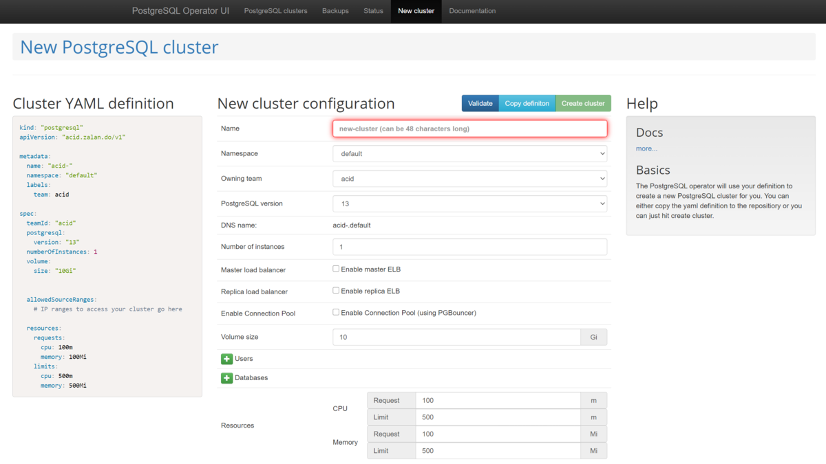 さきほど作成した postgres-operator-ui に Service または Ingress 経由でアクセスすると、クラスタ作成画面が表示されます。