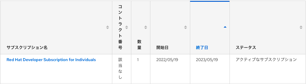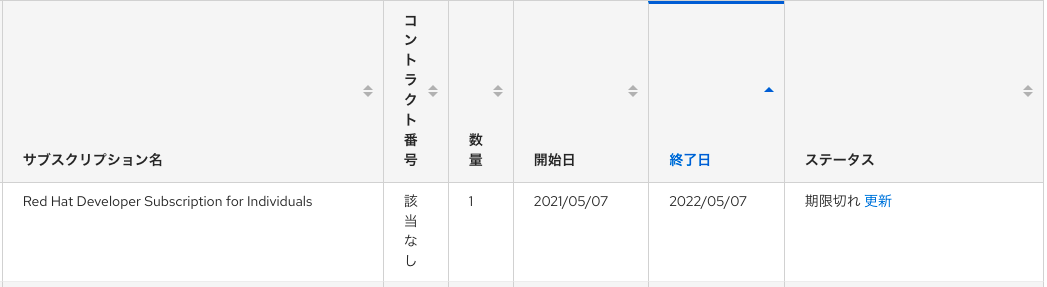 この時点で Developer Subscription の有効期限が切れているのだろうと当たりをつけ、Red Hat Customer Portal からサブスクリプションの状態を確認しました。 案の定、2週間ほど前にサブスクリプションの有効期限が切れていました。