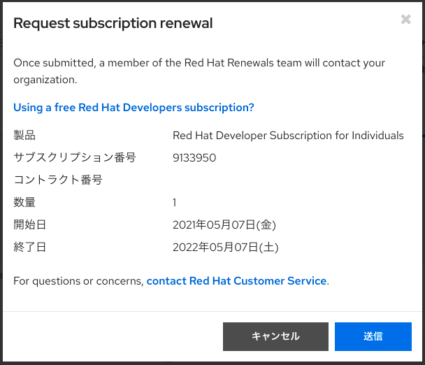 個人利用だし連絡なんかされても困るんだけど…と思っていたらメッセージの下に「Using a free Red Hat Developers subscription?」というリンクがありました。 リンク先は How to renew your Red Hat Developer Subscription for Red Hat Enterprise Linux という Developer Subscription の有効期限が切れた場合の手順を載せた記事でした。