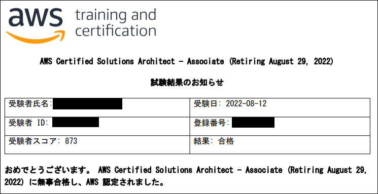 2022/8/12 に AWS 認定の一つ、「AWS Certified Solutions Architect - Associate (SAA)」をパスしたので記録しておく。