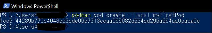 サンプルで表示されているコマンド podman pod create --label myFirstPod を PowerShell で実行してみます。