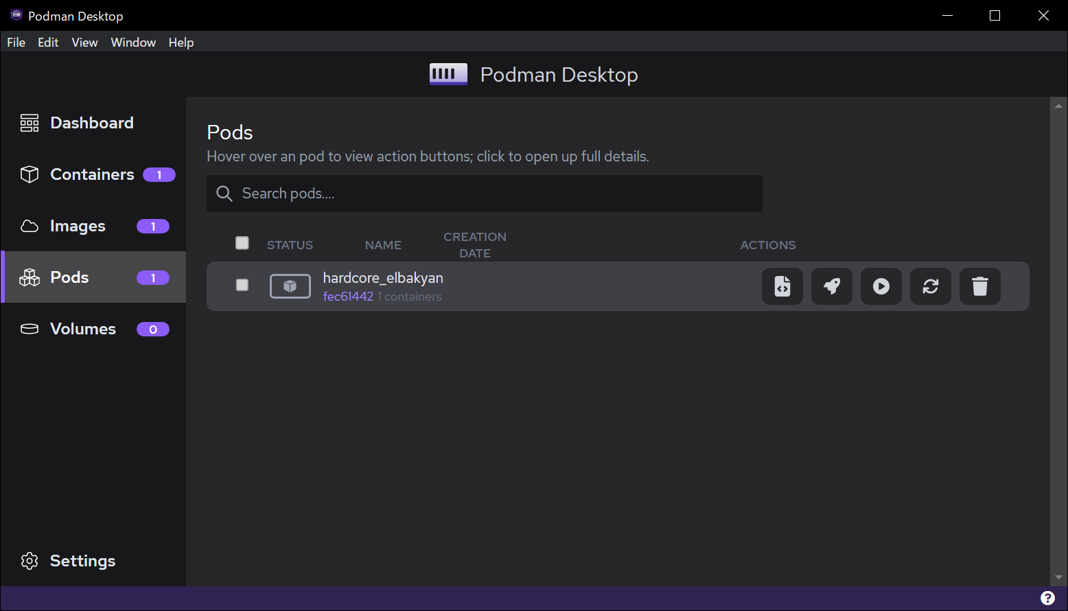 Pod にカーソルを合わせると [ACTIONS] にアイコンが表示されます。 左から