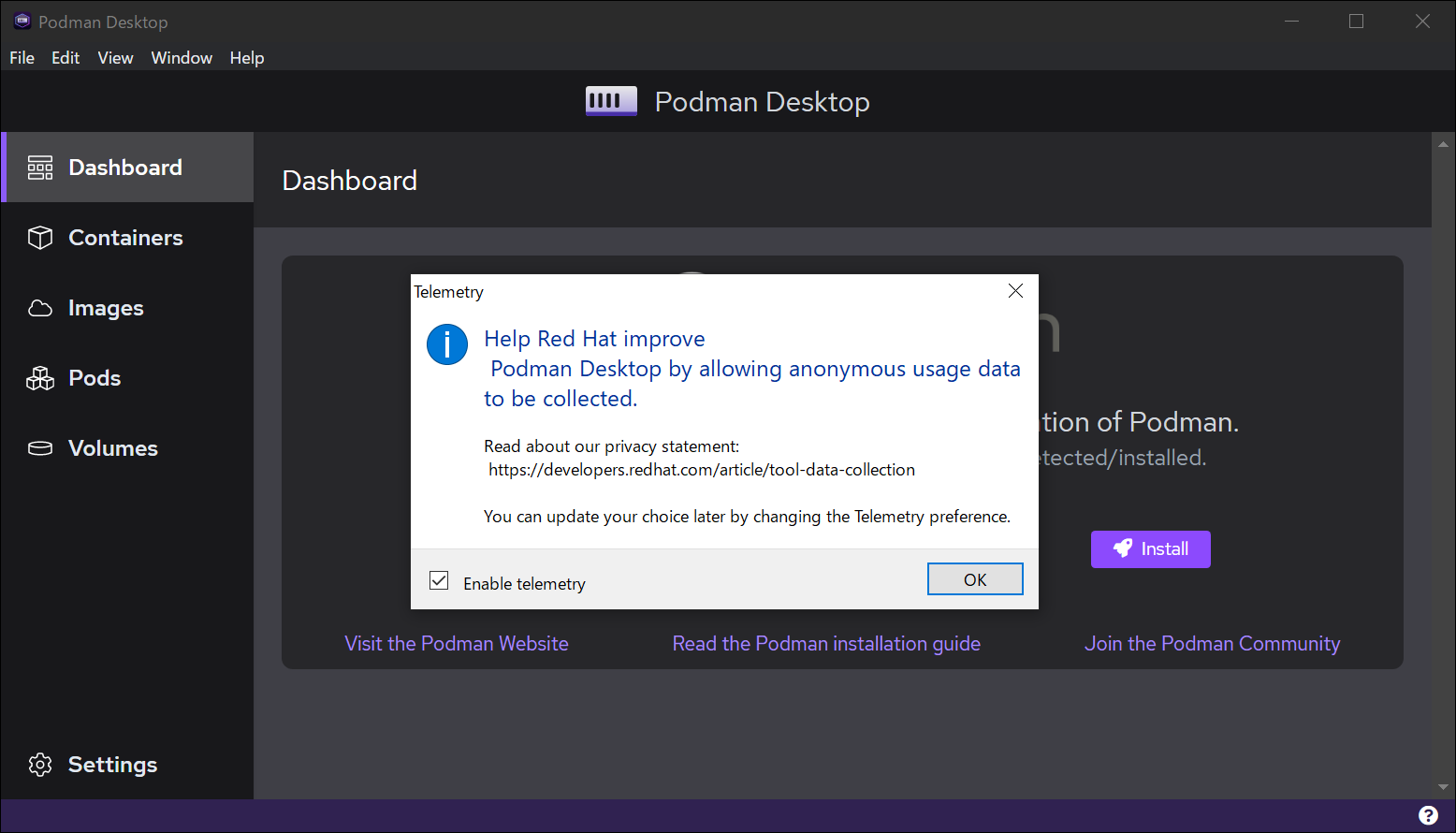 [Install] ボタンを押すと Podman をインストールするか聞かれます。