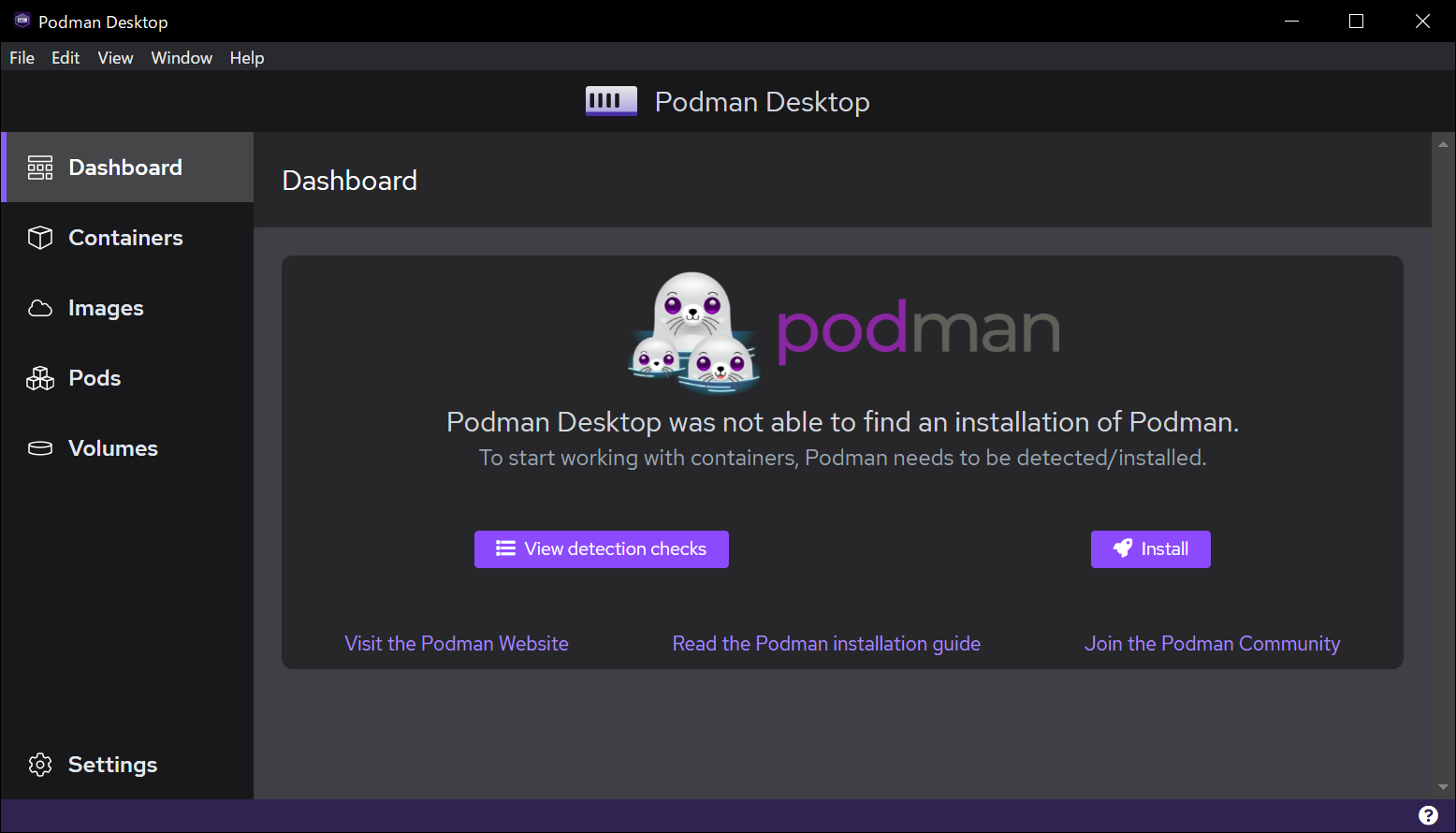 Podman Desktop のダッシュボードが表示されますが、Podman が見つからないと表示されました。 この Windows には Podman 自体もインストールしていませんでした。