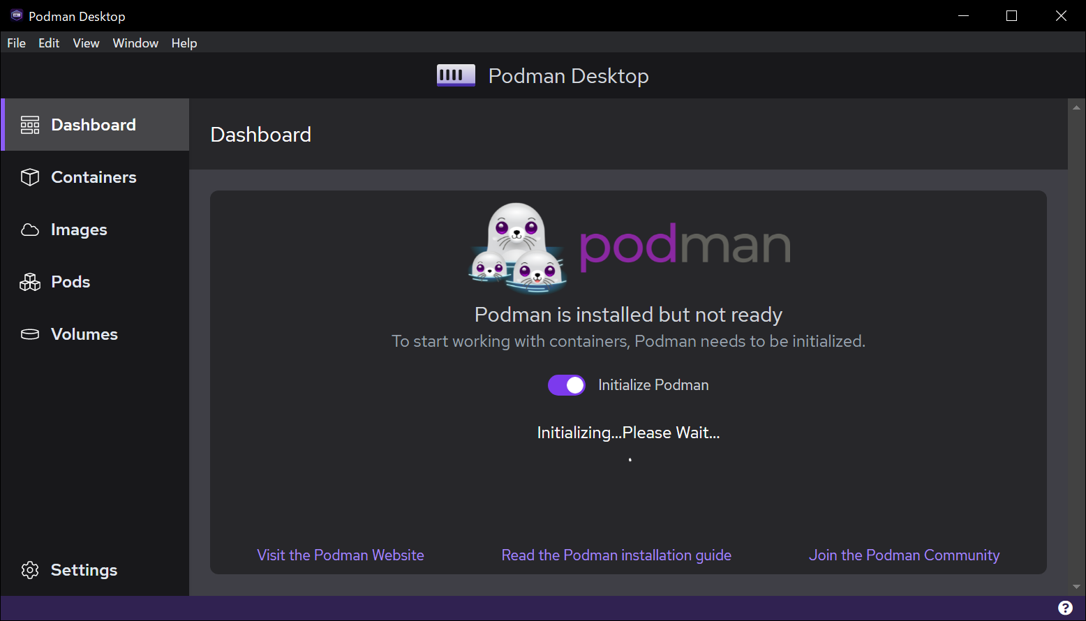 [Initialize Podman] トグルを有効化すると初期化が始まりました。