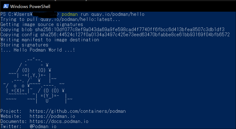 hello, world 用のコマンドが載っていますが、Podman Desktop 上にコンソールぽいものはないので PowerShell から試してみます。