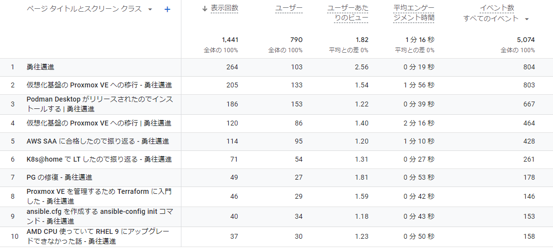 Google Analytics で年間のアクセス数を見ると、以下のような感じでした。 Proxmox VE の記事が多く見ていただけたようです。 Twitter でも Proxmox のワードを見かける頻度が増えた気がします。