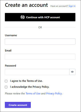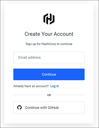 今回は HCP アカウントを使うことにします。 しかし、HashiCorp の SaaS 自体を使ったことがなかったので HCP アカウントも作らないといけません。 HCP アカウントのほうは GitHub のアカウントと連携できるようなので、GitHub アカウントを使うことします。