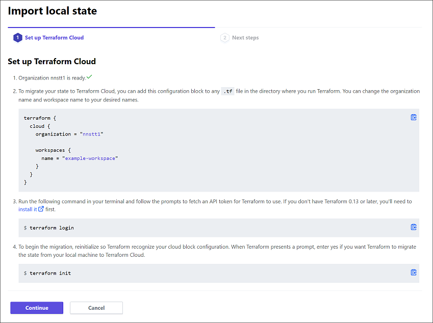 「Import local state」を選択すると、自動的に「組織 (Organization)」が作成されて、状態ファイルを Terraform Cloud に移行する手順が表示されます。 ワークスペース名は任意で設定できます。