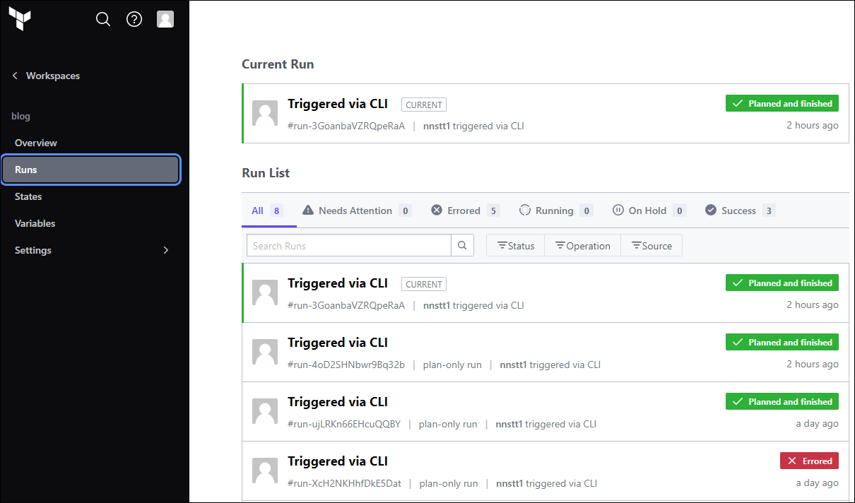 このように Terraform Cloud では実行履歴も確認できます。