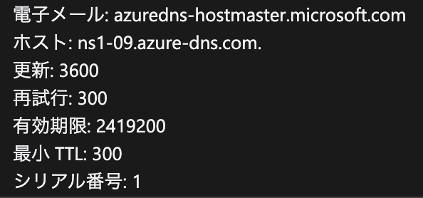 Azure DNS ゾーンに登録されている SOA レコードと一致するため、委任できていることが確認できました。
