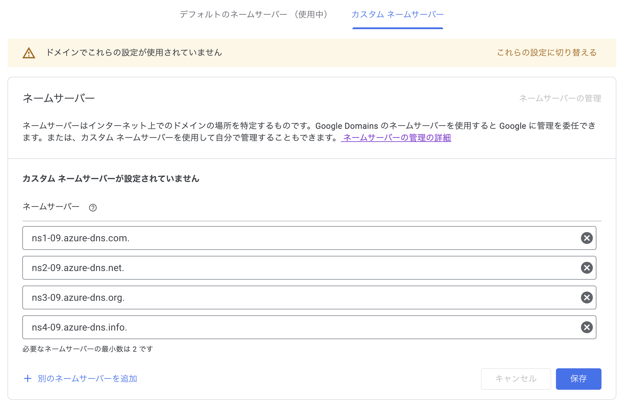 Google Domains でカスタムネームサーバの設定をします。 Azure DNS ゾーンで割り当てられている 4 つのネームサーバを入力します。