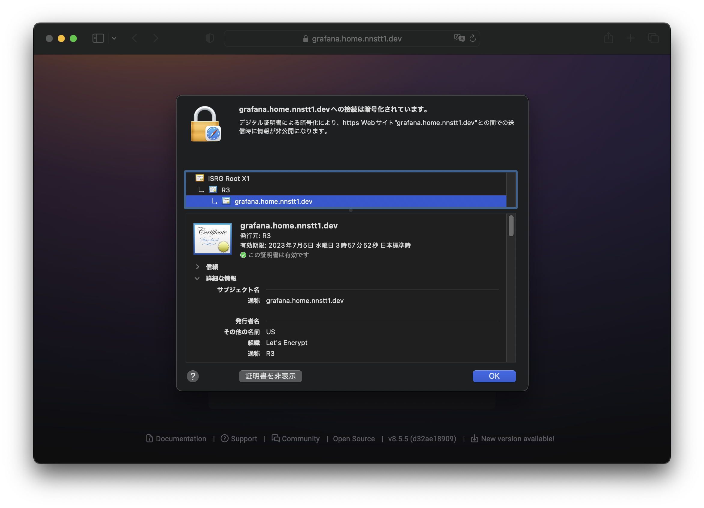 これにより、自宅ラボの Ingress で公開したサービス (今回の例では https://grafana.home.nnstt1.dev) に対してアクセスしてもブラウザで警告が表示されなくなりました。