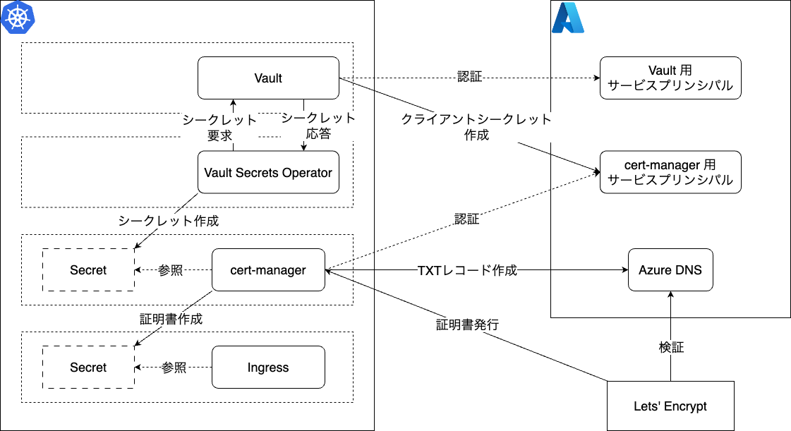 このとき、cert-manager は Microsoft Entra ID のサービスプリンシパルを使います。 サービスプリンシパルのクライアントシークレットは有効期限が最大でも 2 年間 (24 ヶ月) なので、HashiCorp Vault と Vault Secrets Operator を使ってクライアントシークレットを動的に生成して、クライアントシークレットの有効期限を意識せずにサービスプリンシパルを使えるようにします。