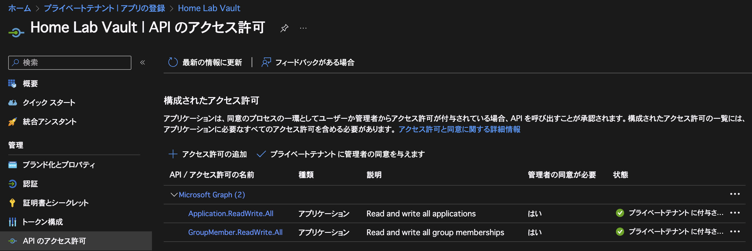 アクセス許可を追加したあとに忘れず「プライベートテナントに管理者の同意を与えます」を押しておきます。 設定後のアクセス許可はこんな感じです。