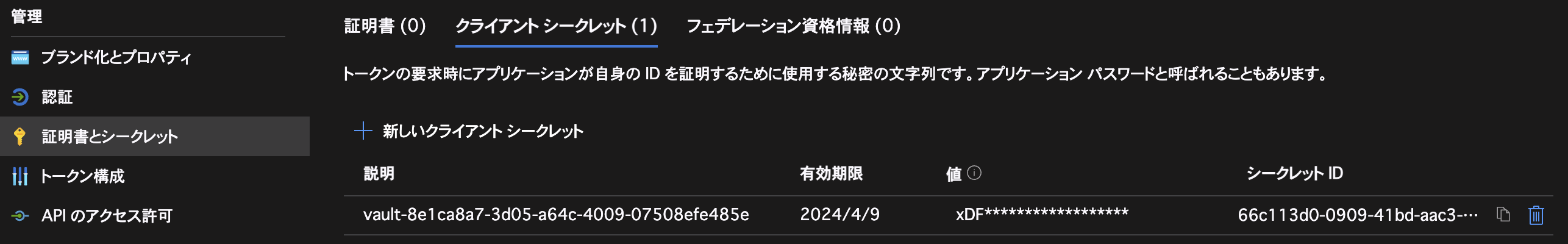ローテーションを設定すると事前に作成していたルート認証情報としてのクライアントシークレットは削除されて、新たに Vault がクライアントシークレットを作成します。 このクライアントシークレットの有効期限は半年です。