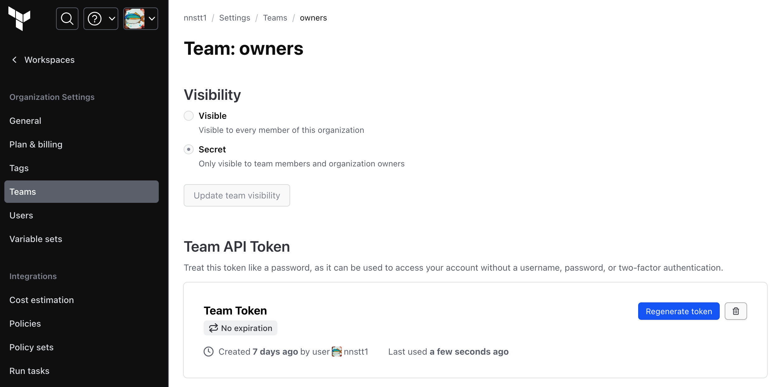 次に、TFC Operator が Terraform Cloud にアクセスする際に使用するトークンを Secret リソースとして作成します。 このトークンは Terraform Cloud の [Organization Settings] → [Teams] → [Team API Token] から取得します。