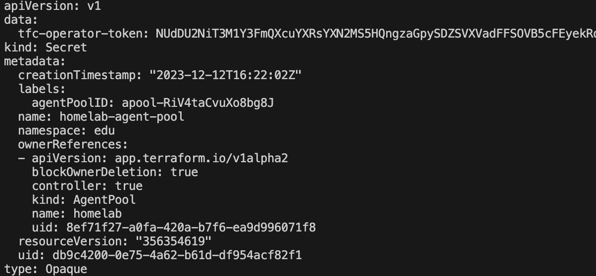 このトークンは TFC Operator によってエージェントプール上で作成され、その値は Secret リソースとして格納され、Terraform Cloud エージェントから参照されます。