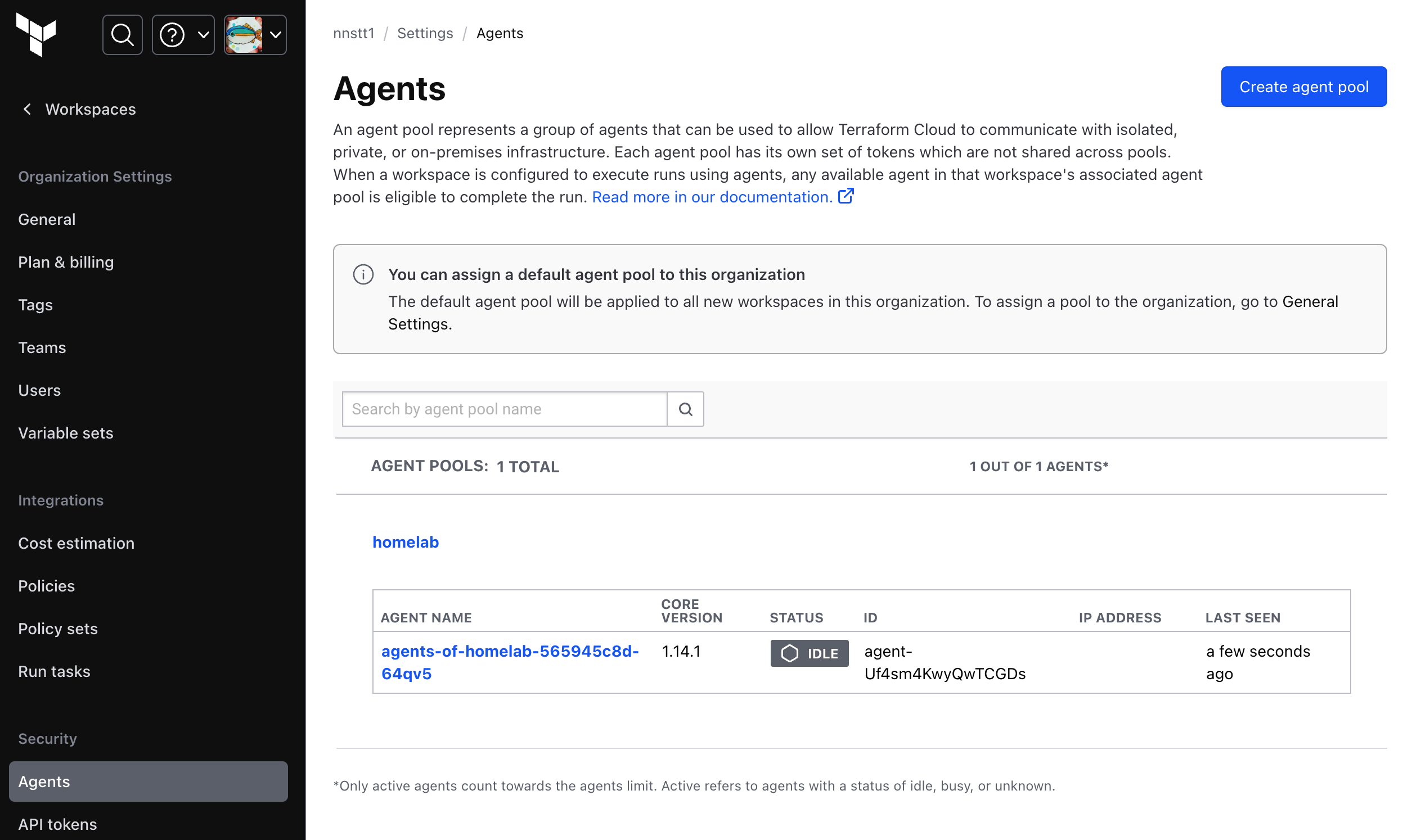 Terraform Cloud のエージェントプールを確認するとマニフェストで指定した homelab という名前のエージェントプールが作成されていました。