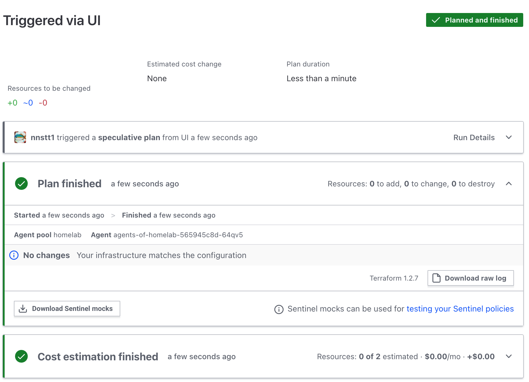 Apply まで実行していませんが、Terraform Cloud から自宅ラボの Terraform Cloud エージェントを起動することができました。