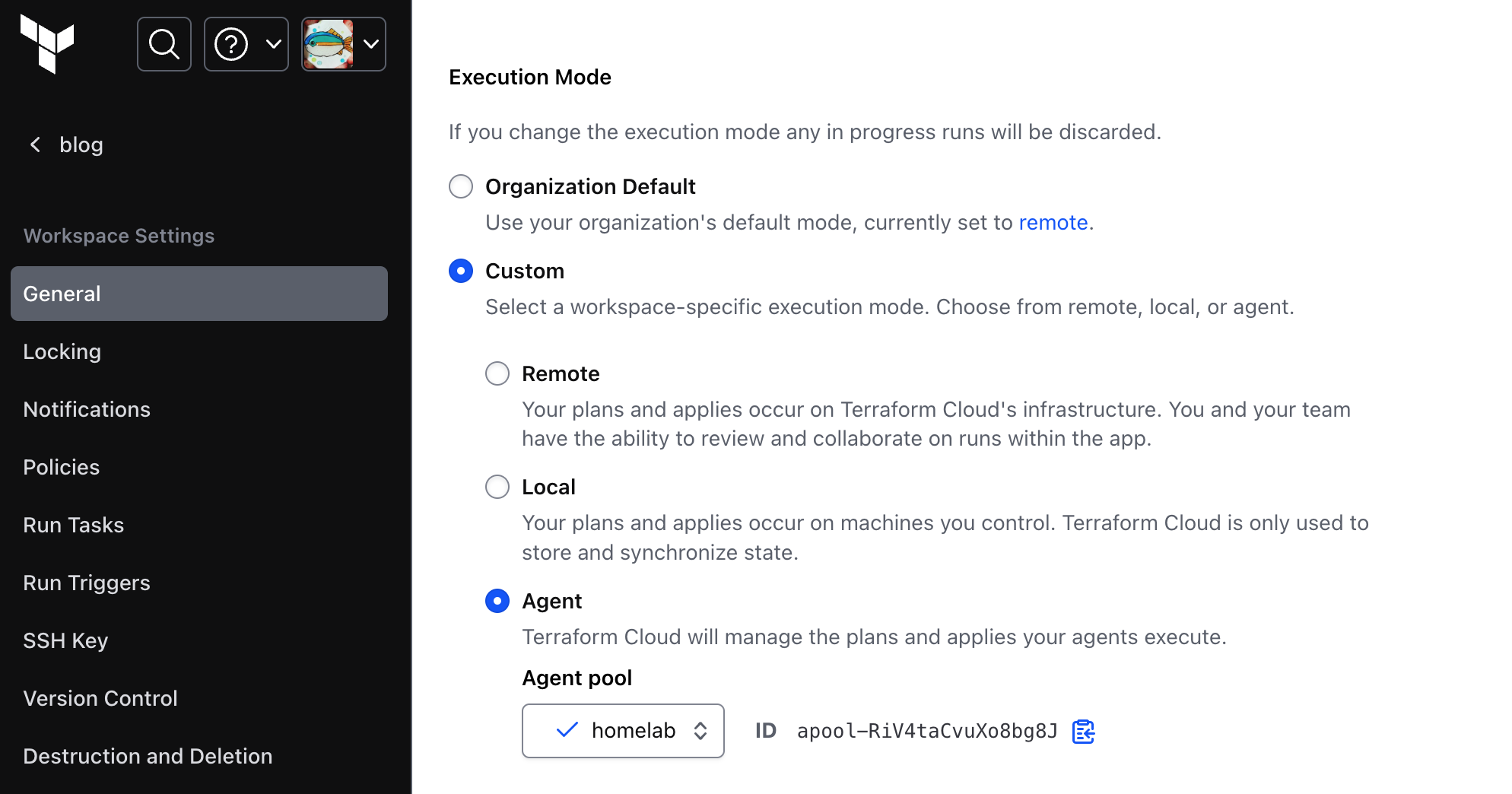 TFC Operator でワークスペースの管理もできるのですが、今回は既存のワークスペースの実行モードを手動で [Agent] に変更しました。