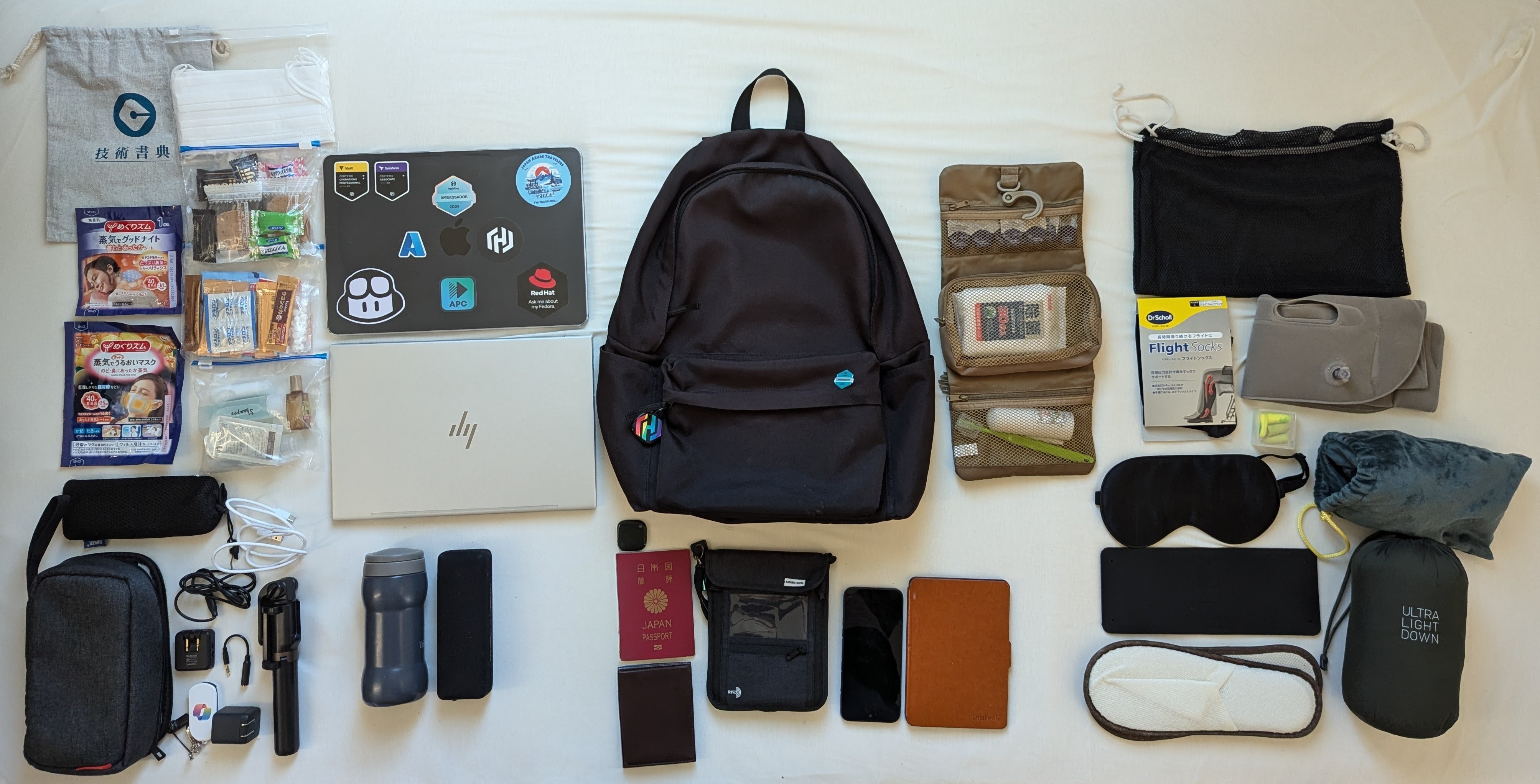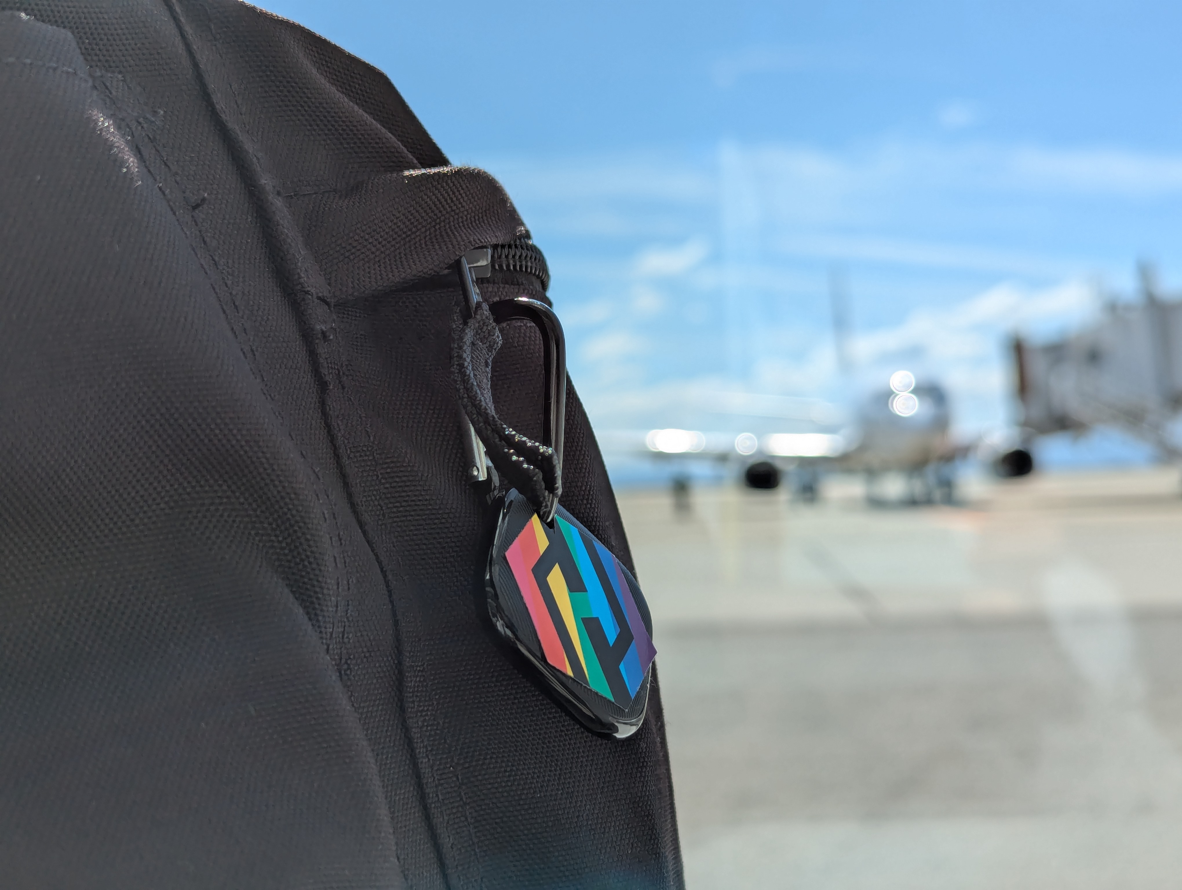 12時頃、最寄り空港を出発。 HashiCorp ロゴのシールを貼った紛失防止トラッカーをリュックにつけての出発直前の一枚。