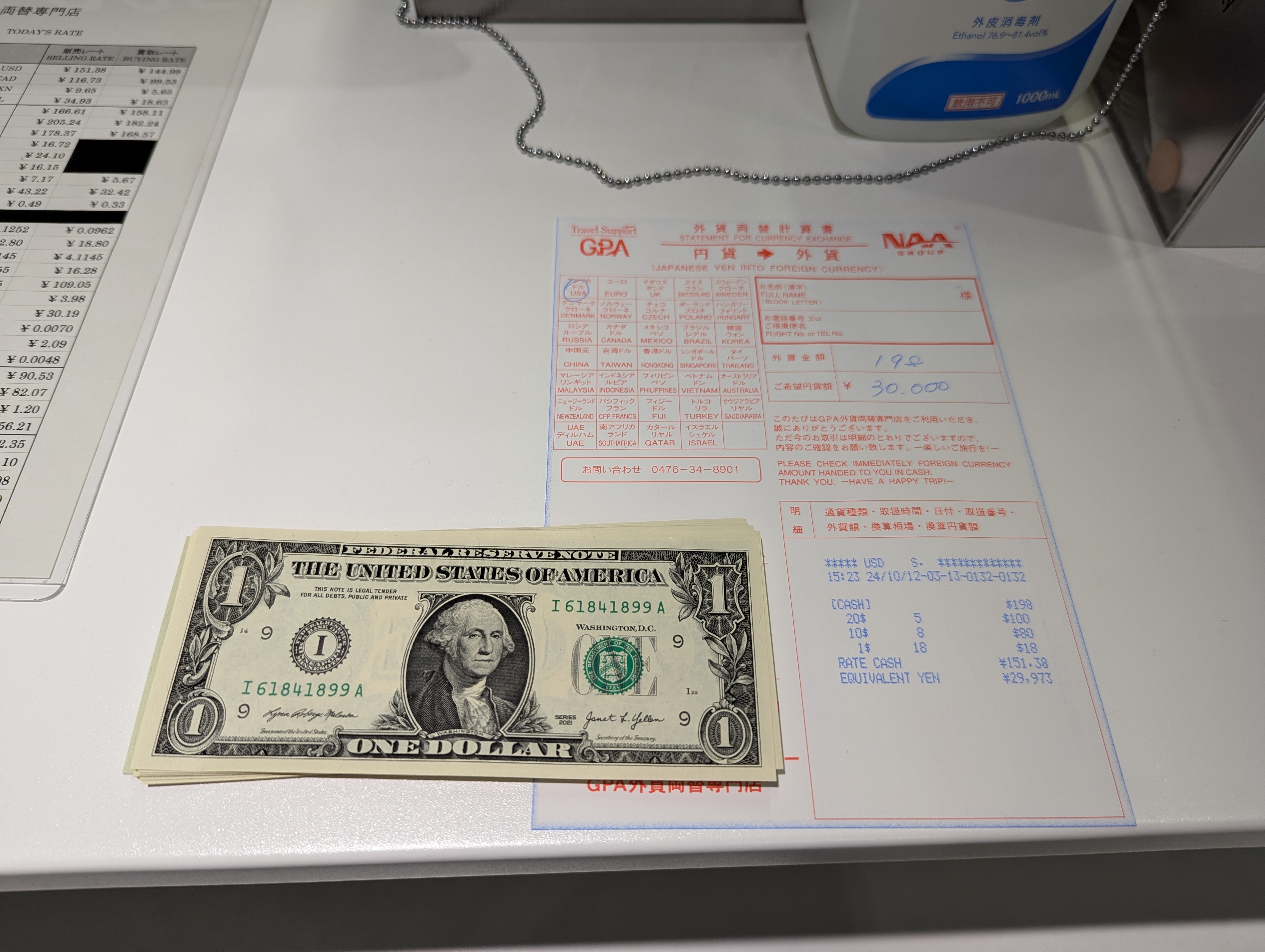 1ドル144.98円で出てたけど、手数料などもあって1ドル151.38円。 約3万円分を両替して198ドルに。