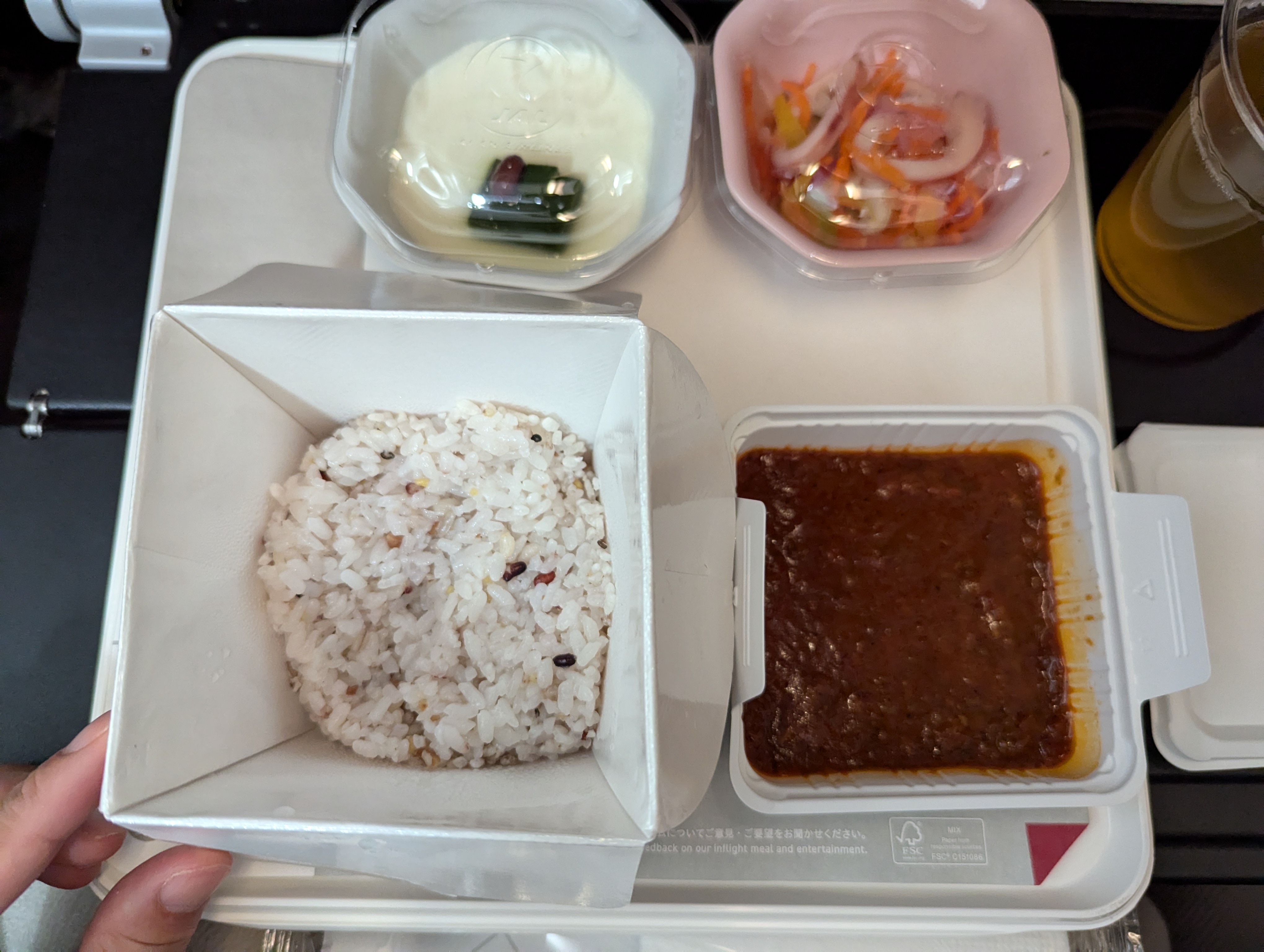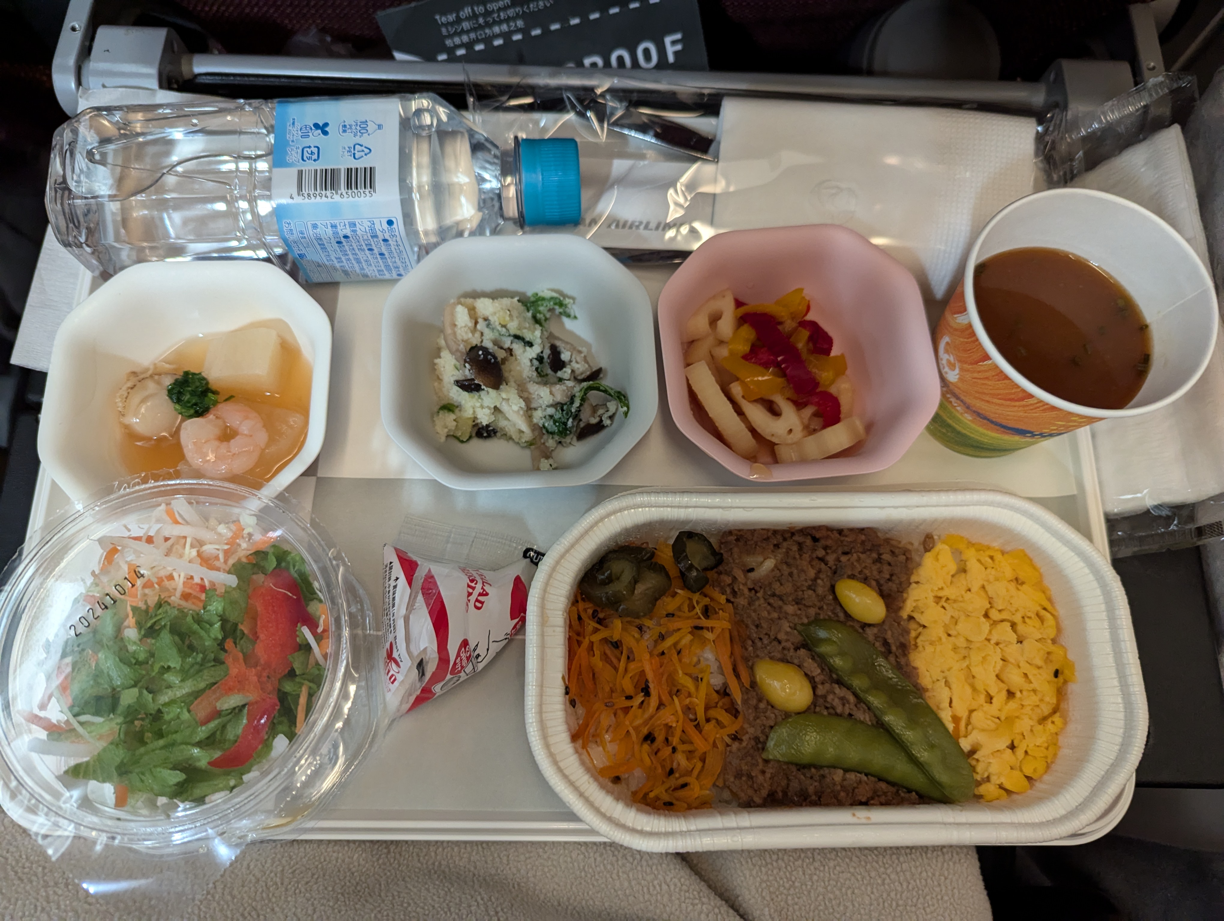 1回目の機内食。 機内食は前の席から提供されるので最後列に順番が回ってくるのはかなり遅い。