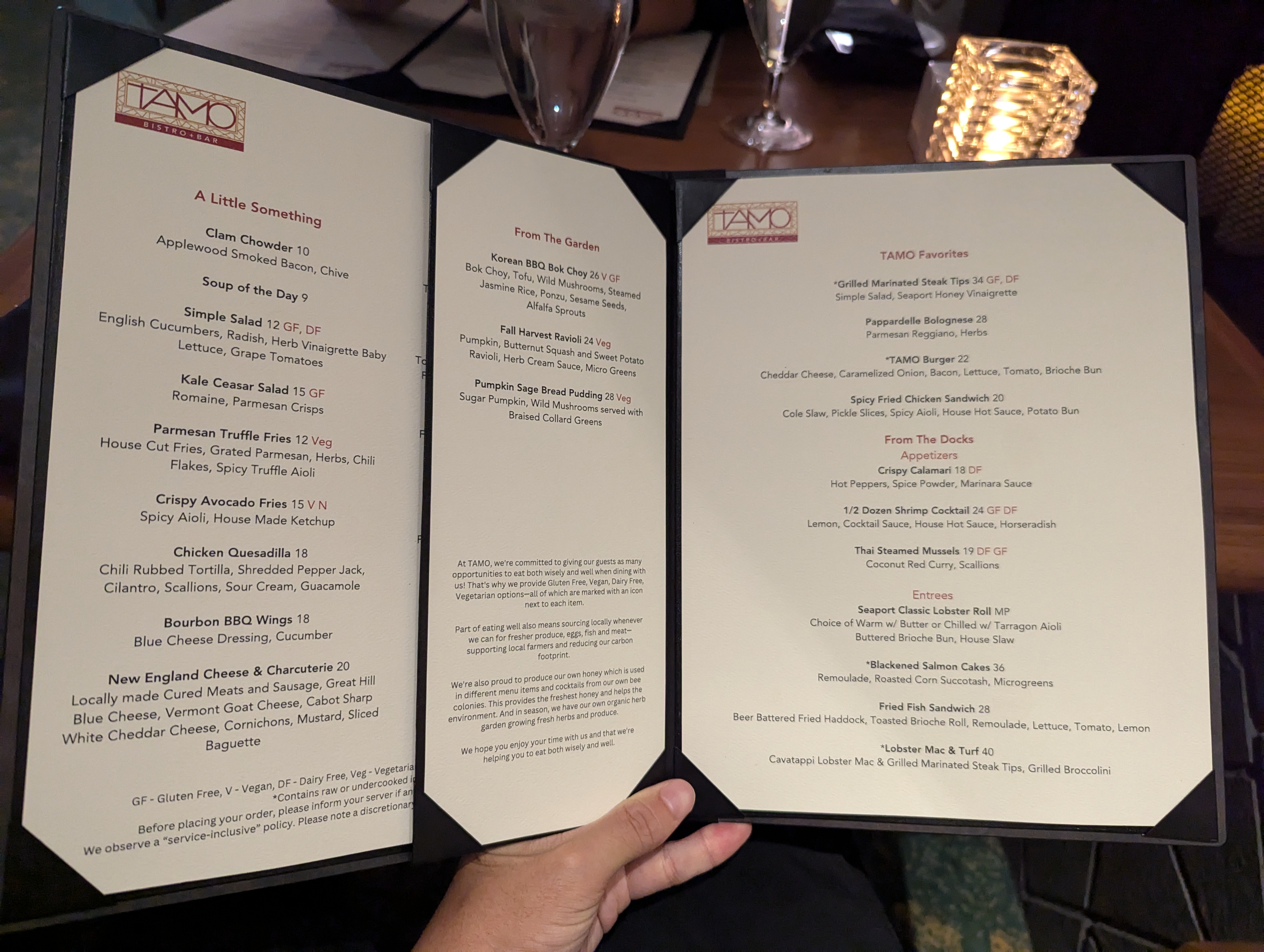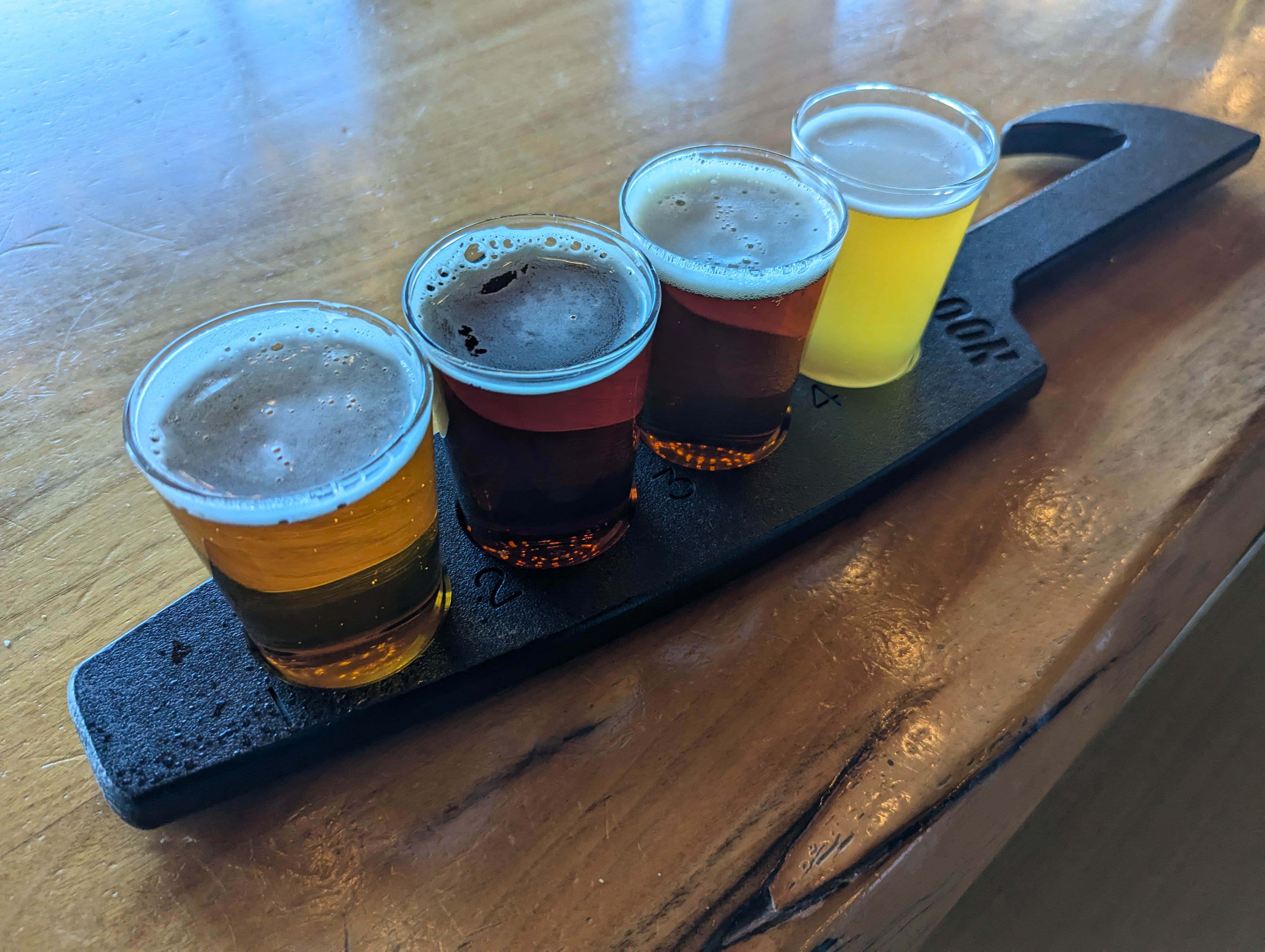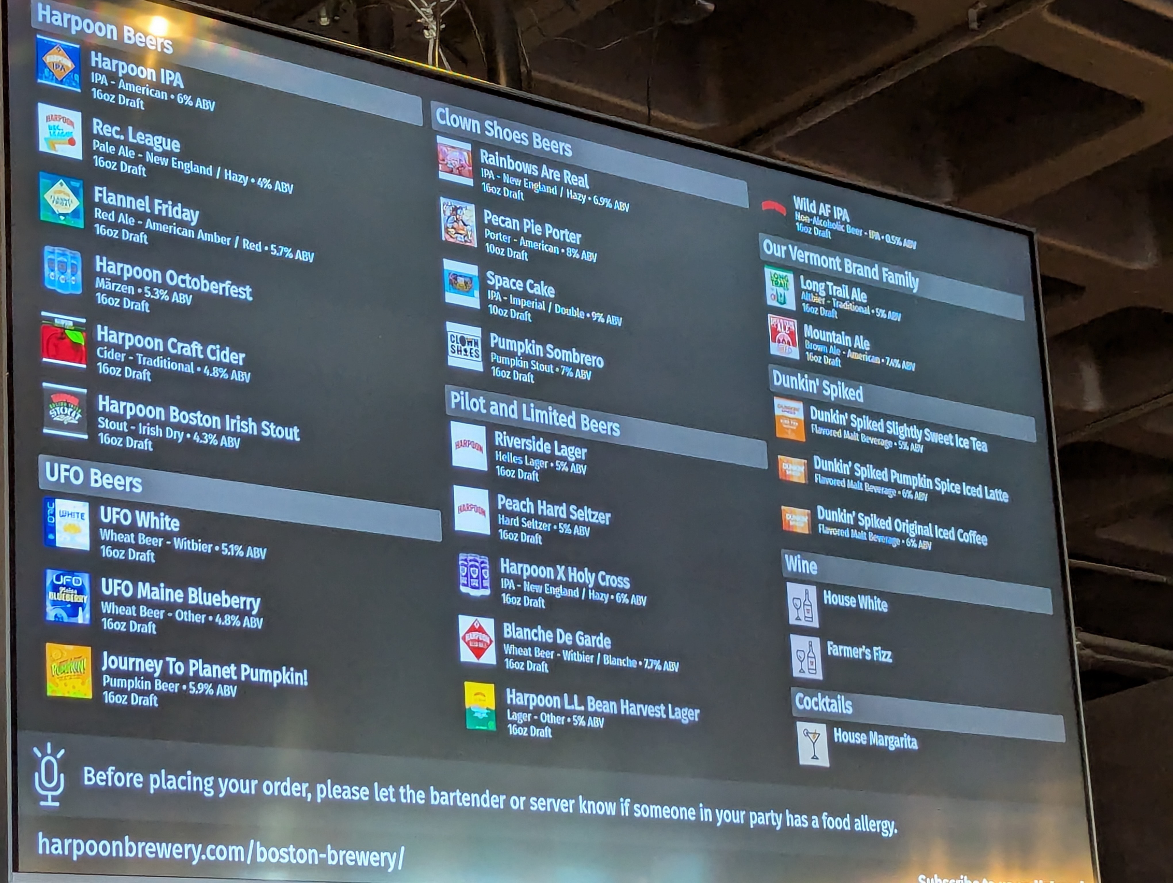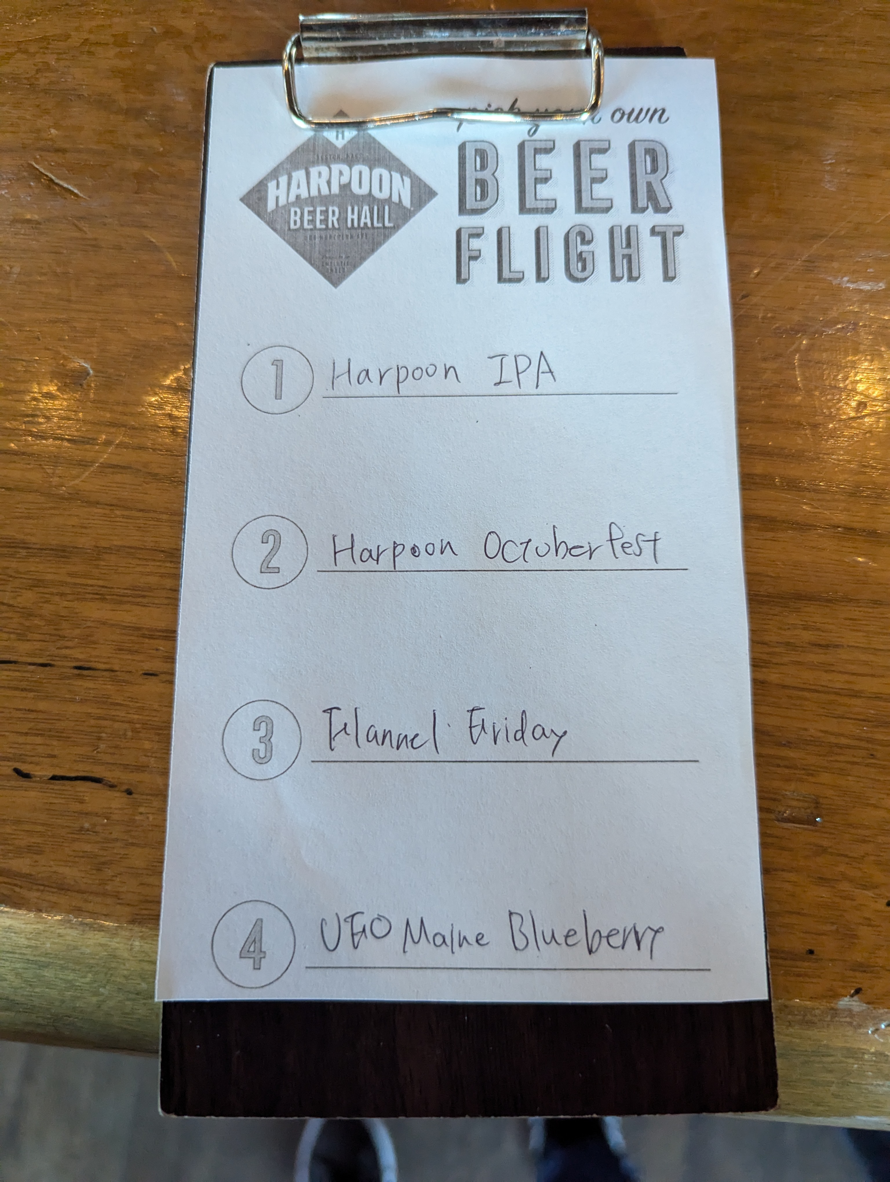 Harpoon IPA だけでなく様々な種類、味のビールがあった。 少量でいろんな味を楽しみたいと思いながらメニューを見ていると、隣席のグループが小グラスに入ったビールの飲み比べをしているぽい様子だった。 注文の仕方を聞いてみると「Flight って注文すればいいよ」とのことだった。 帰国してから調べると Flight は飲み比べセットを注文するときの一般的な用語らしかった。