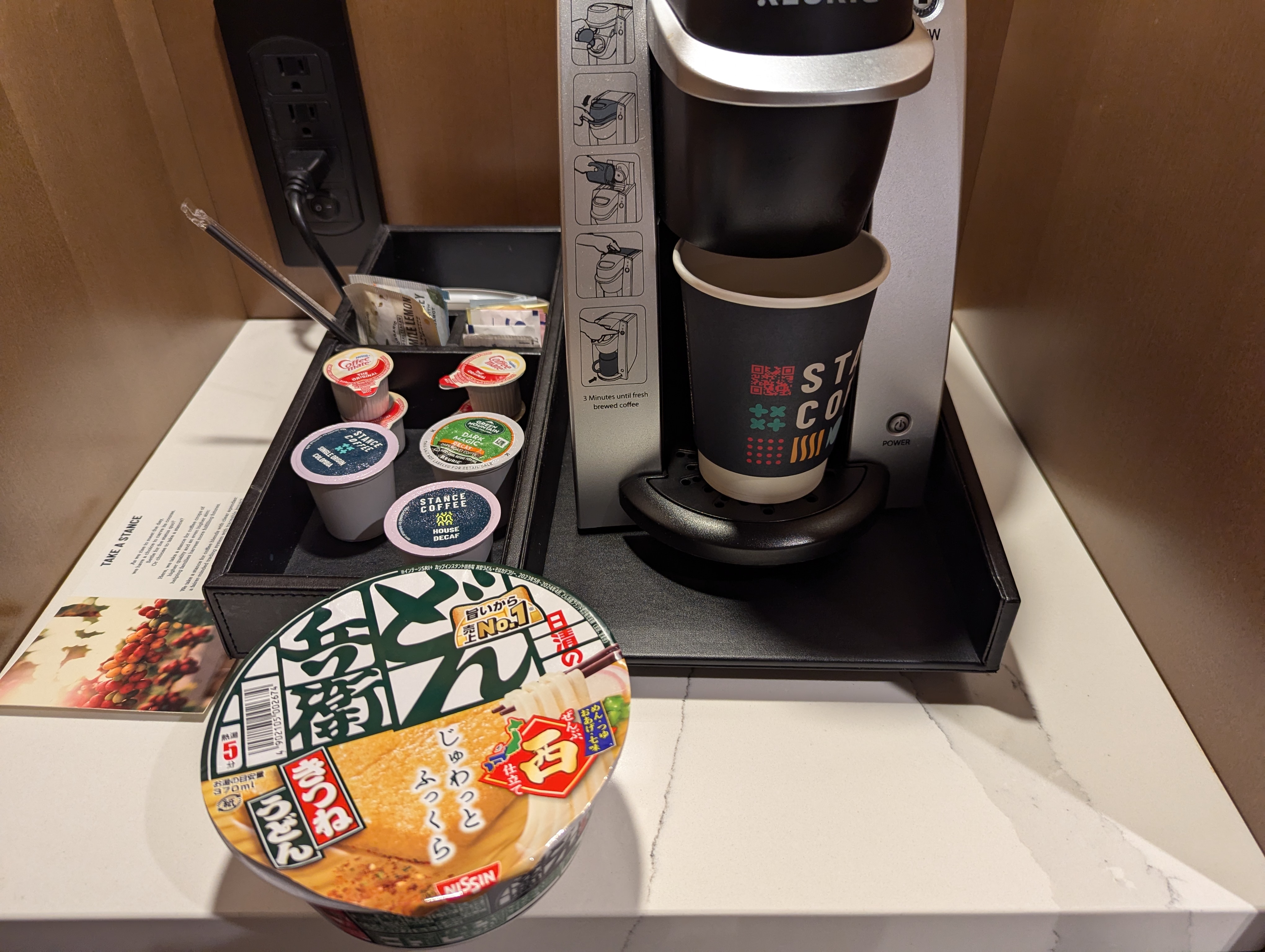 他の参加者からホテル内にウォーターサーバーがあるよと聞いていたので、水筒と空のペットボトルを持ってホテルを散策。 無事にウォーターサーバーを発見できてどん兵衛にありつけた。