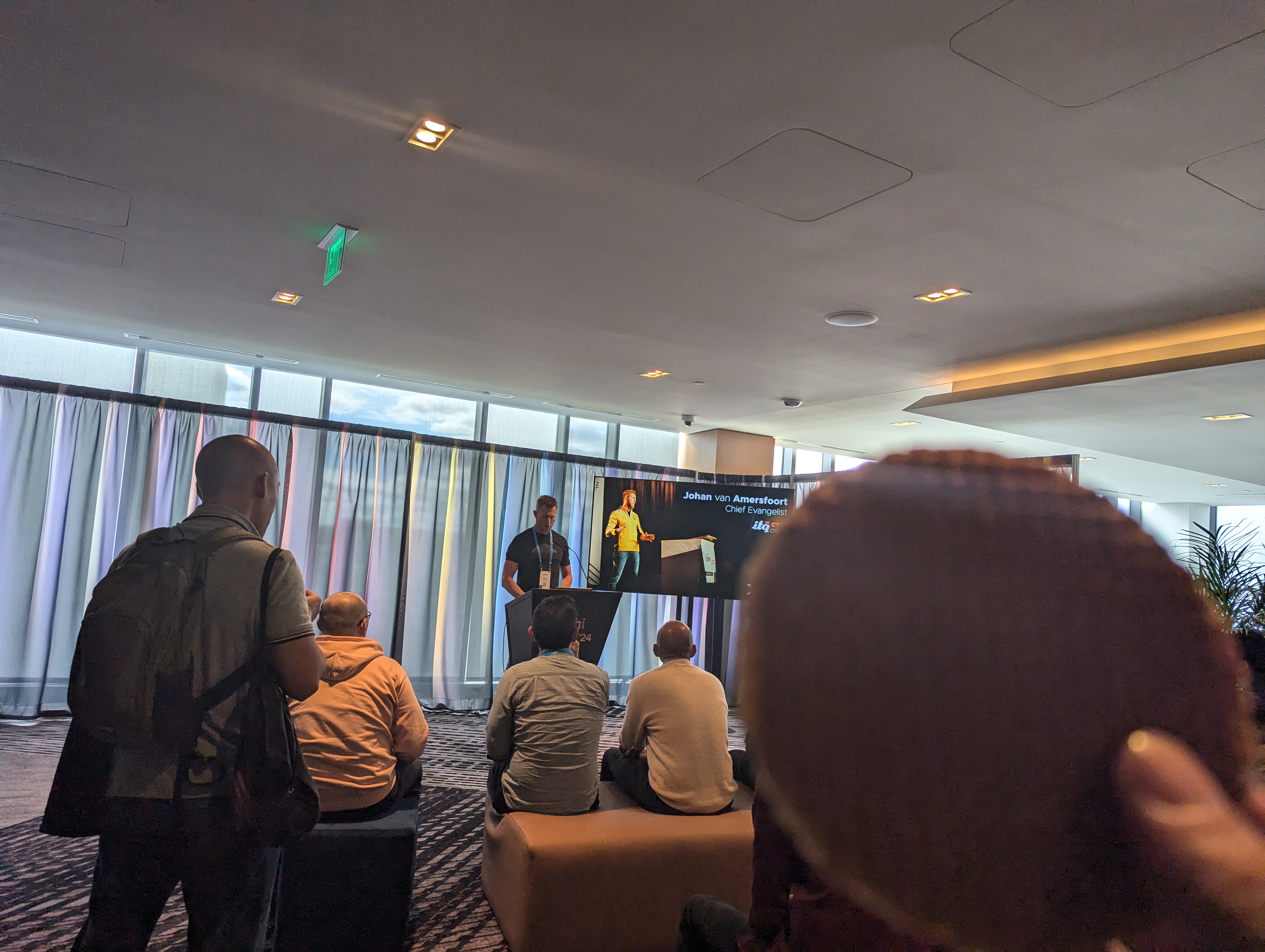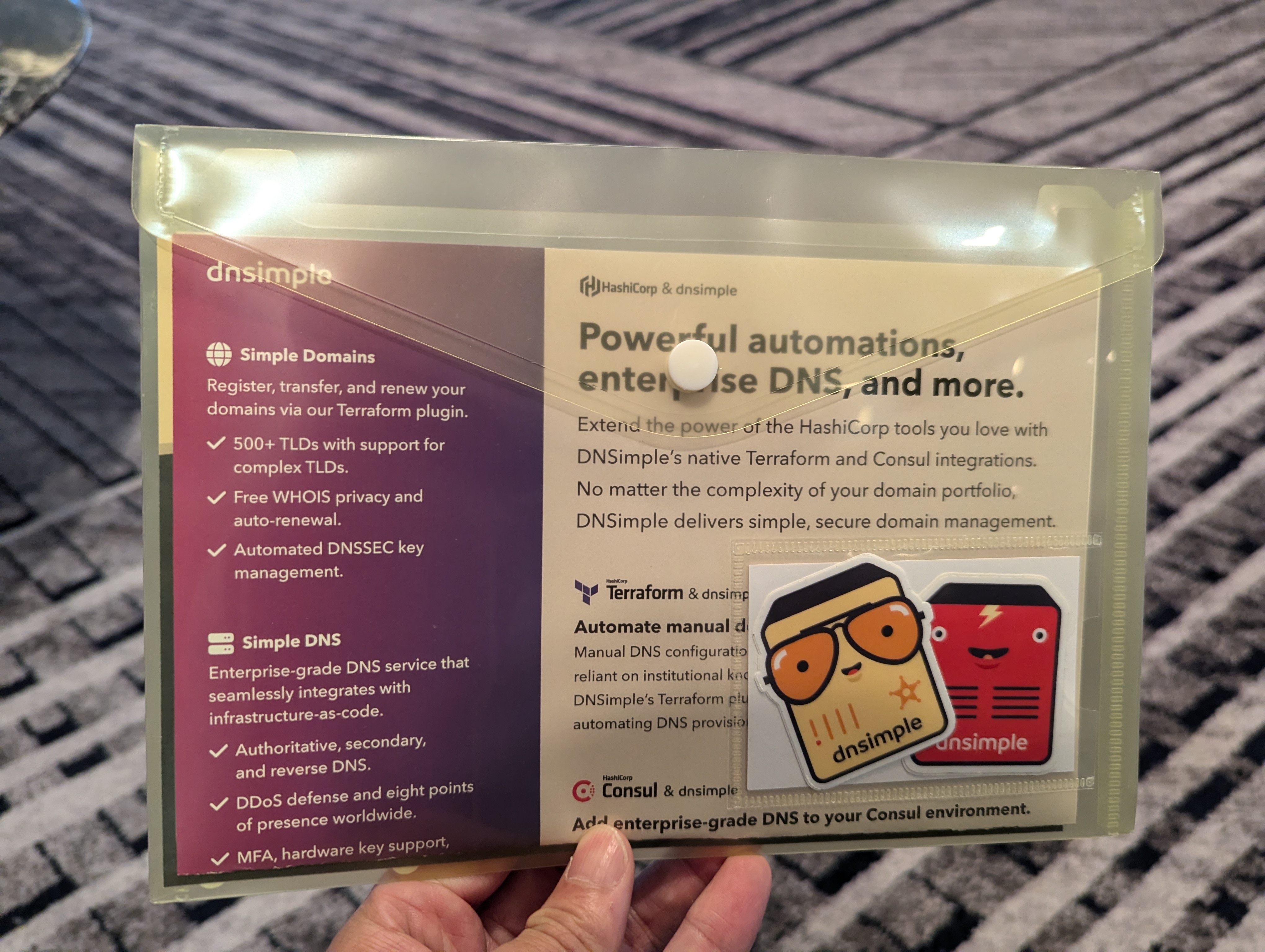 この日も昼食の写真を撮り忘れた。 昼食後に座って次の時間を待っていると、HUG on the Harbor で知り合った dnsimple の方が声を掛けてくれた。 少し話したあと dnsimple の資料とステッカーをいただいた。 異国の地でこんな風に接してもらえると嬉しくなる、dnsimple 使います(ちょろい)。