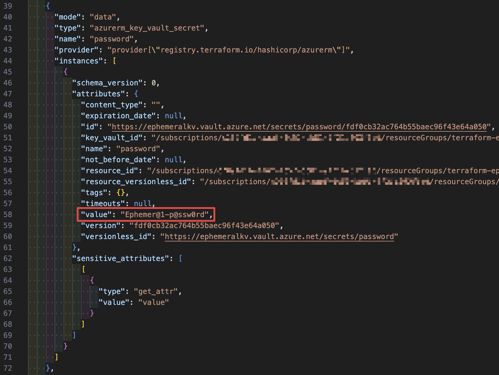 今回は resource "azurerm_key_vault_secret" というブロックにパスワードを記述していて、State ファイルを開くとそのままパスワードが見えてしまいますね。