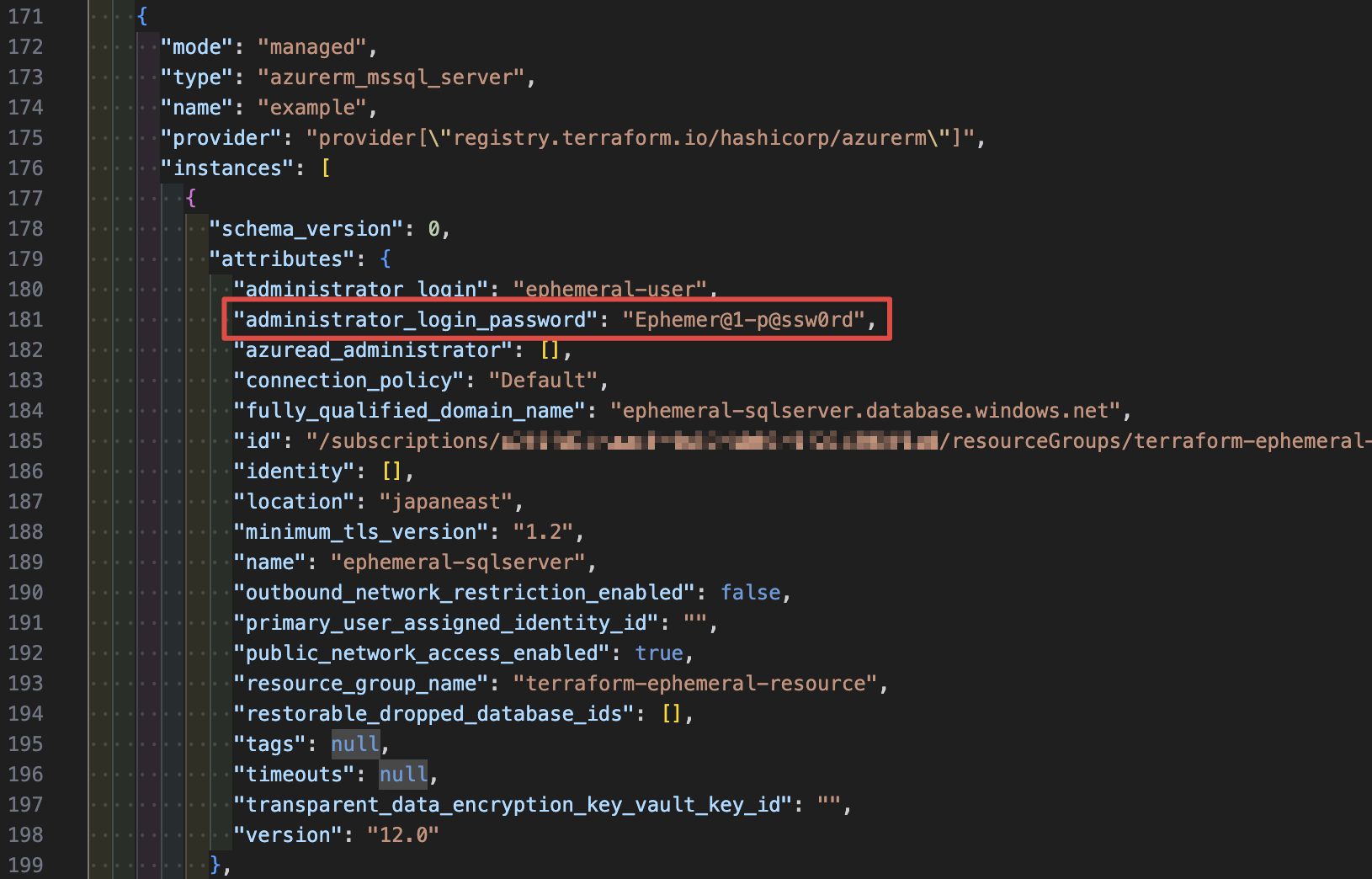 "administrator_login_password": "Ephemer@1-p@ssw0rd", <- パスワード