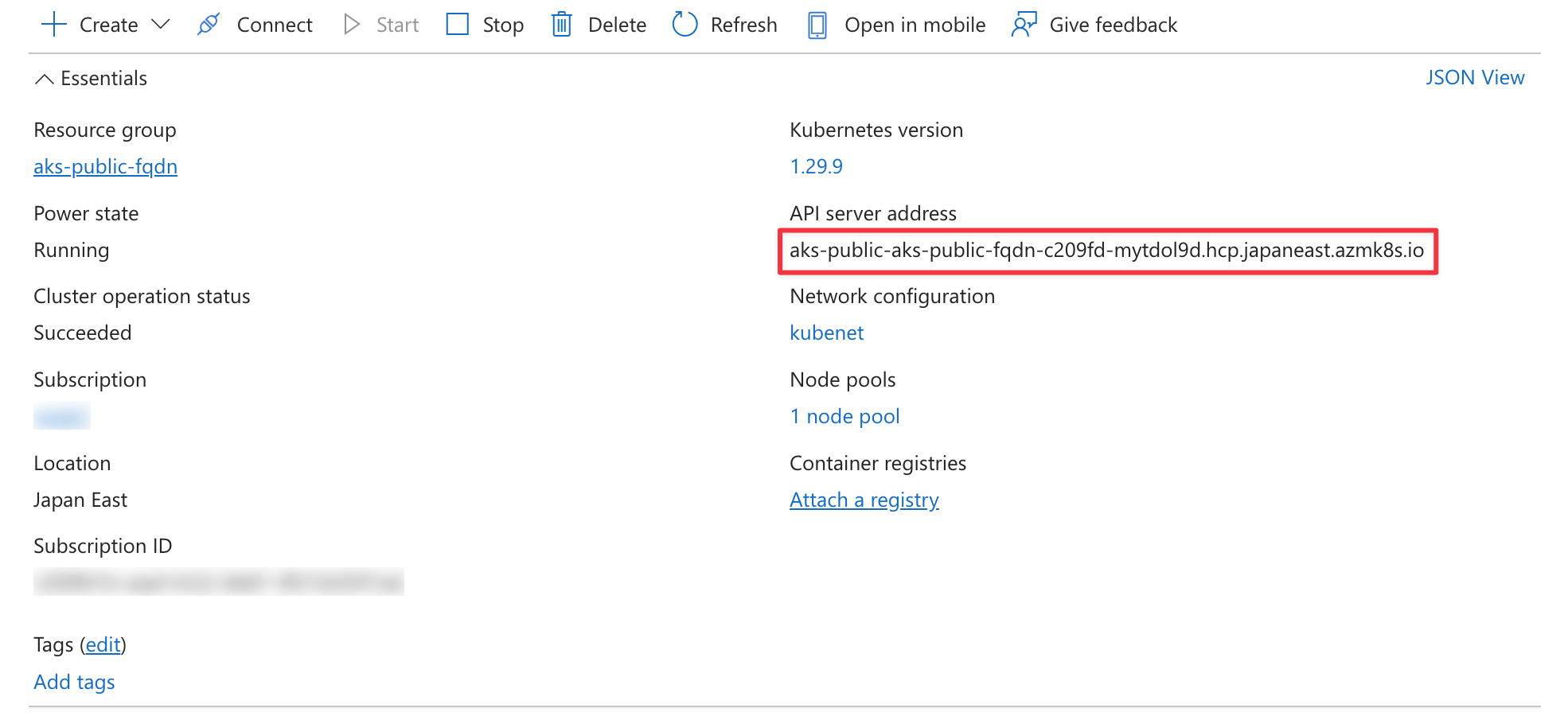 server: https://aks-public-aks-public-fqdn-c209fd-mytdol9d.hcp.japaneast.azmk8s.io:443