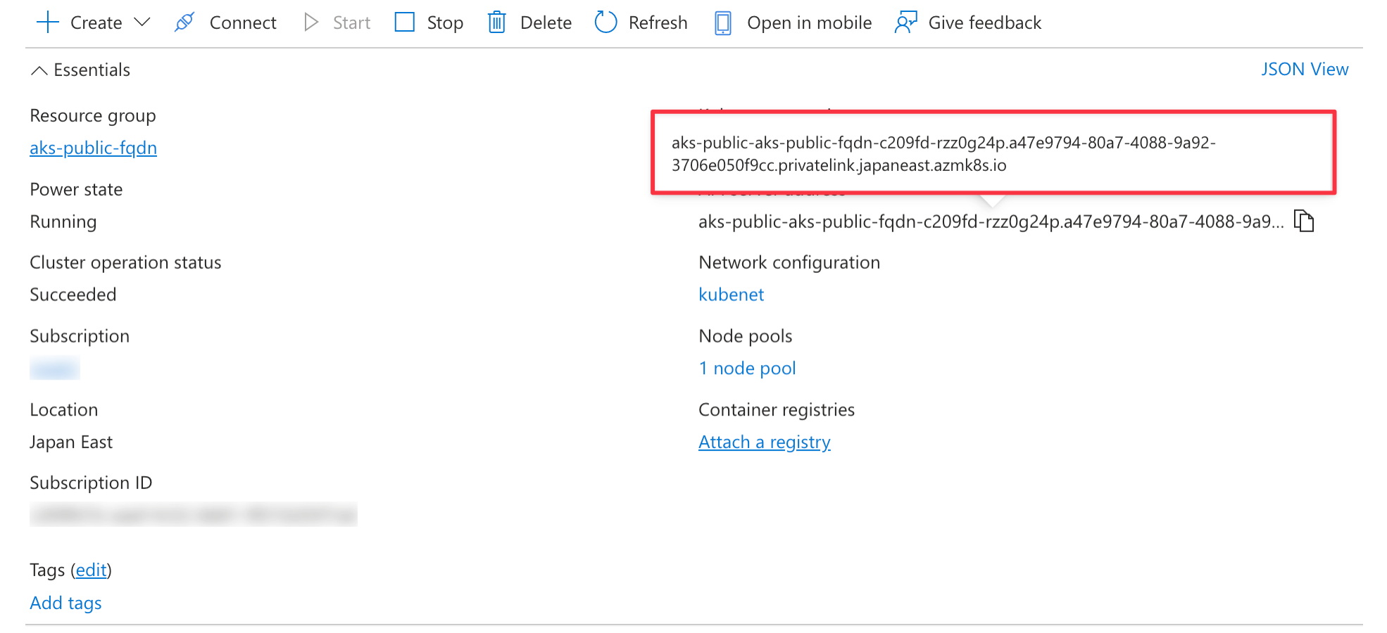 server: https://aks-public-aks-public-fqdn-c209fd-lr5umuys.512317f1-59e4-4ef2-90c5-ae3724da2543.privatelink.japaneast.azmk8s.io:443