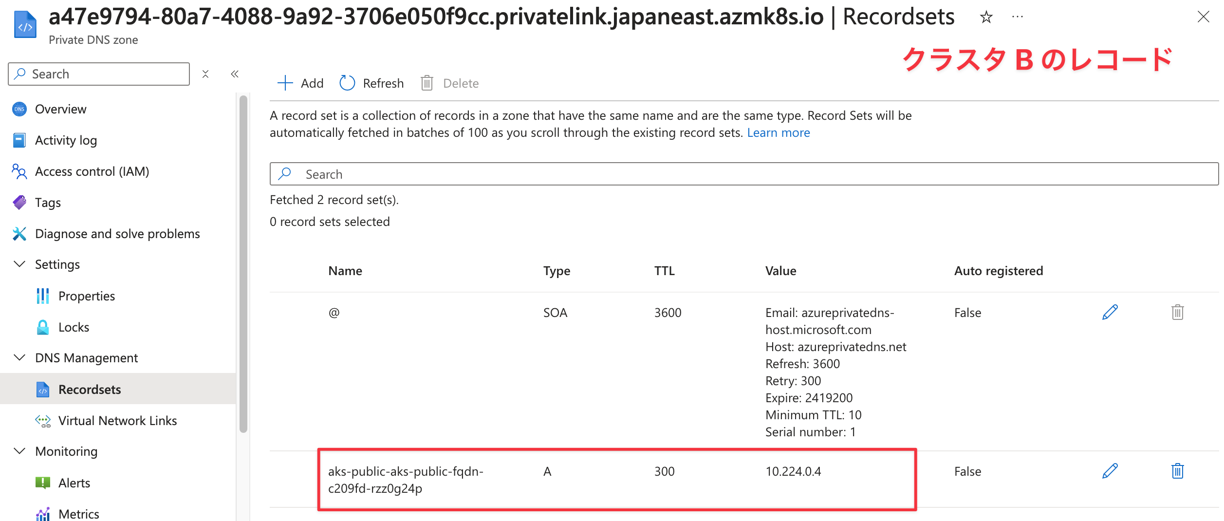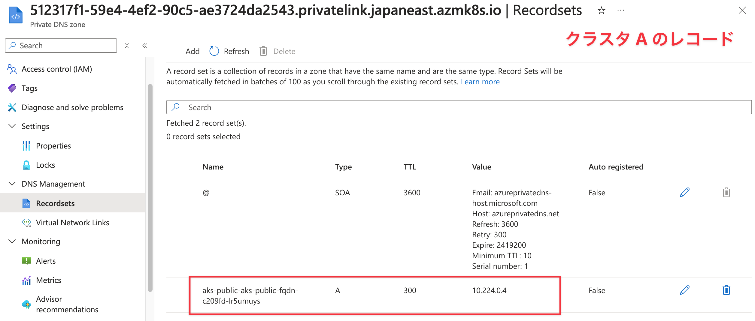 両方とも 00000000-0000-0000-0000-000000000000.privatelink.<location>.azmk8s.io というゾーンに aks-public-aks-public-fqdn-c209fd-xxxxxxx という A レコードが登録されていました。