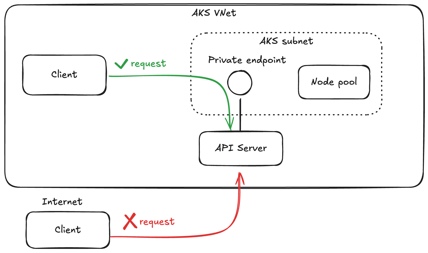 プライベート AKS クラスタでは、API サーバー用のプライベート エンドポイントが AKS 用の VNet 内に作成されます。 このプライベート エンドポイントが Microsoft が管理する AKS クラスタのコントロール プレーンと Azure Private Link サービスで繋がっています。 クライアントはプライベート エンドポイントにアクセスできれば API サーバーにアクセスできることになります。