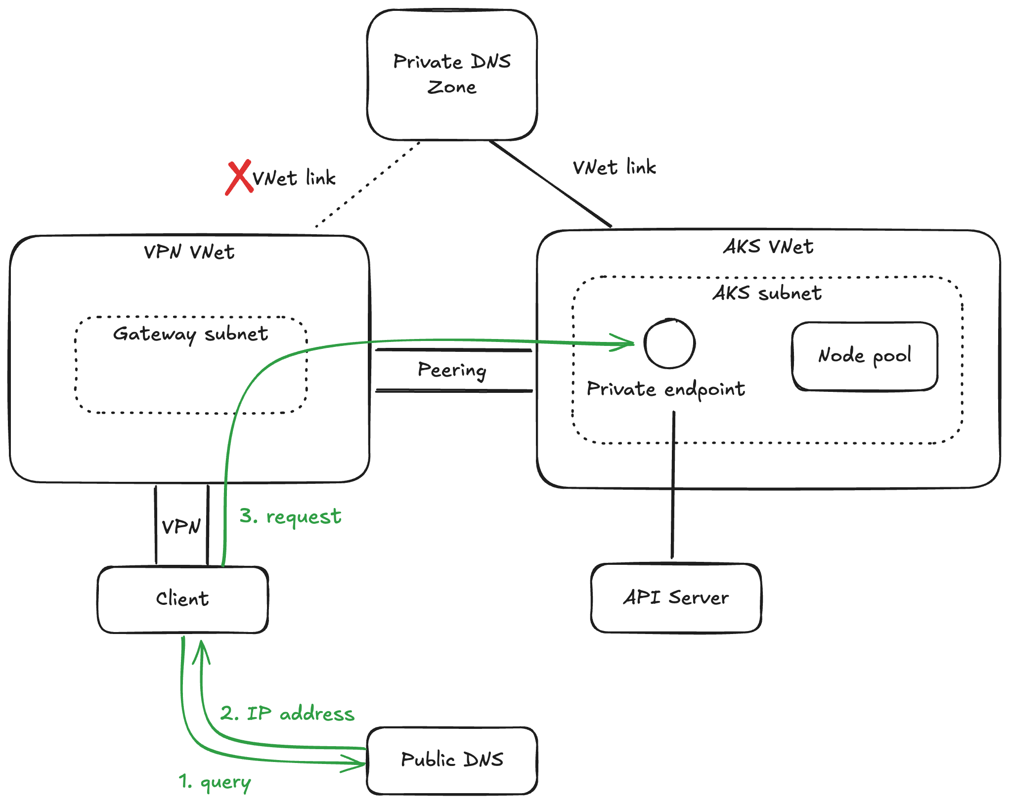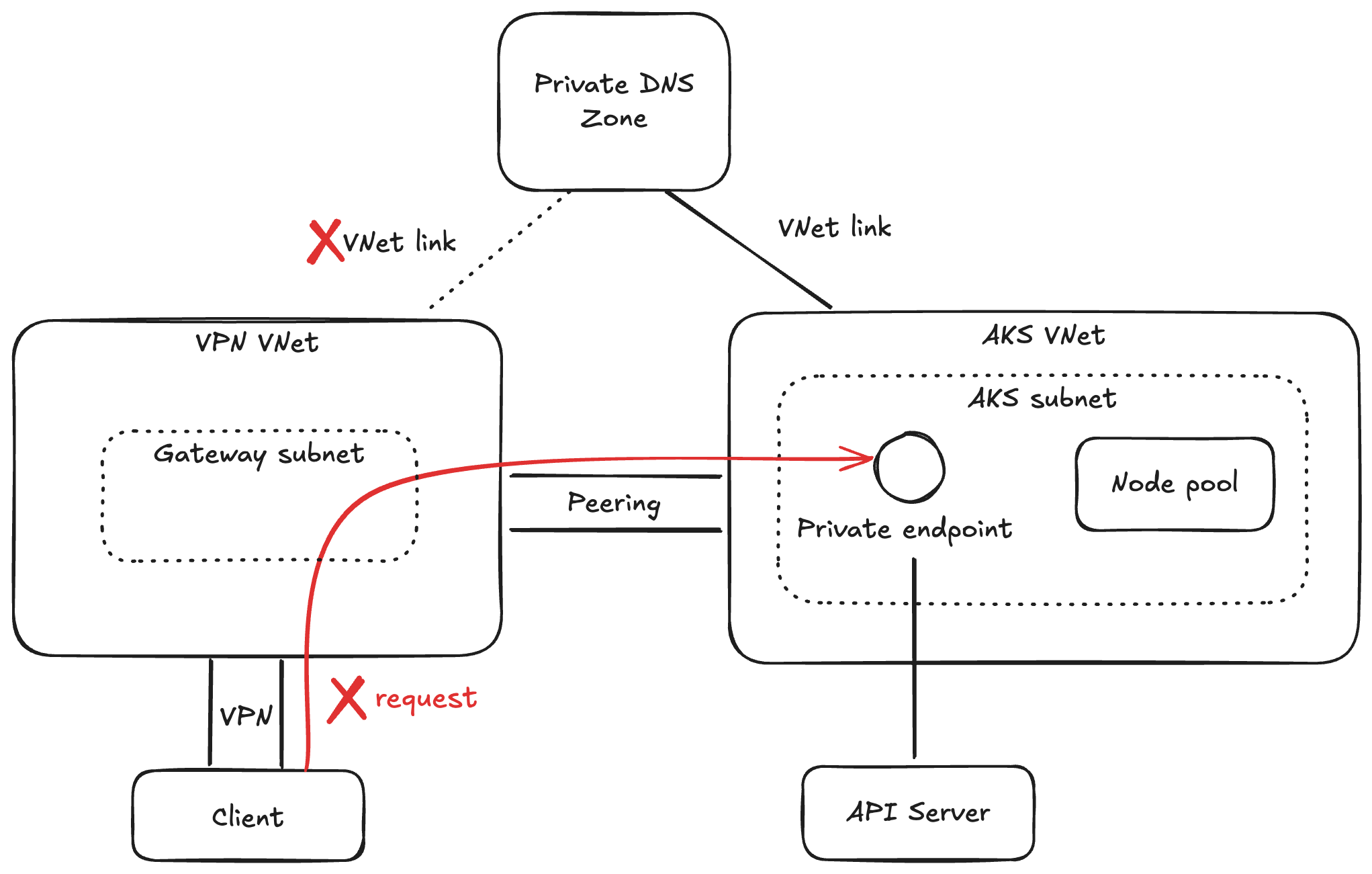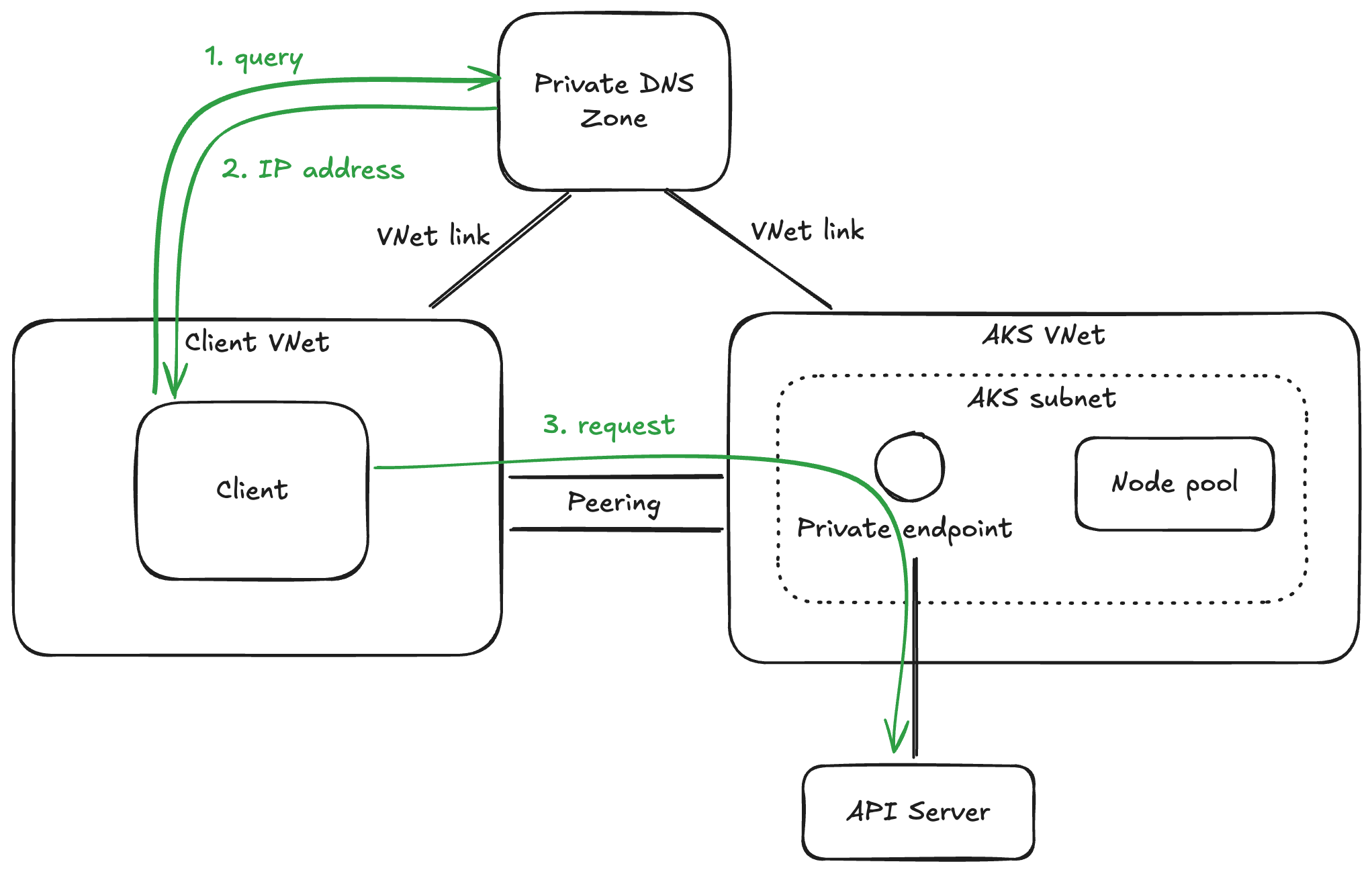 プライベート エンドポイントにアクセスするには、クライアントが AKS 用の VNet 内にいること、または VNet ピアリングして AKS 用 VNet にアクセスできること等の前提条件があります。