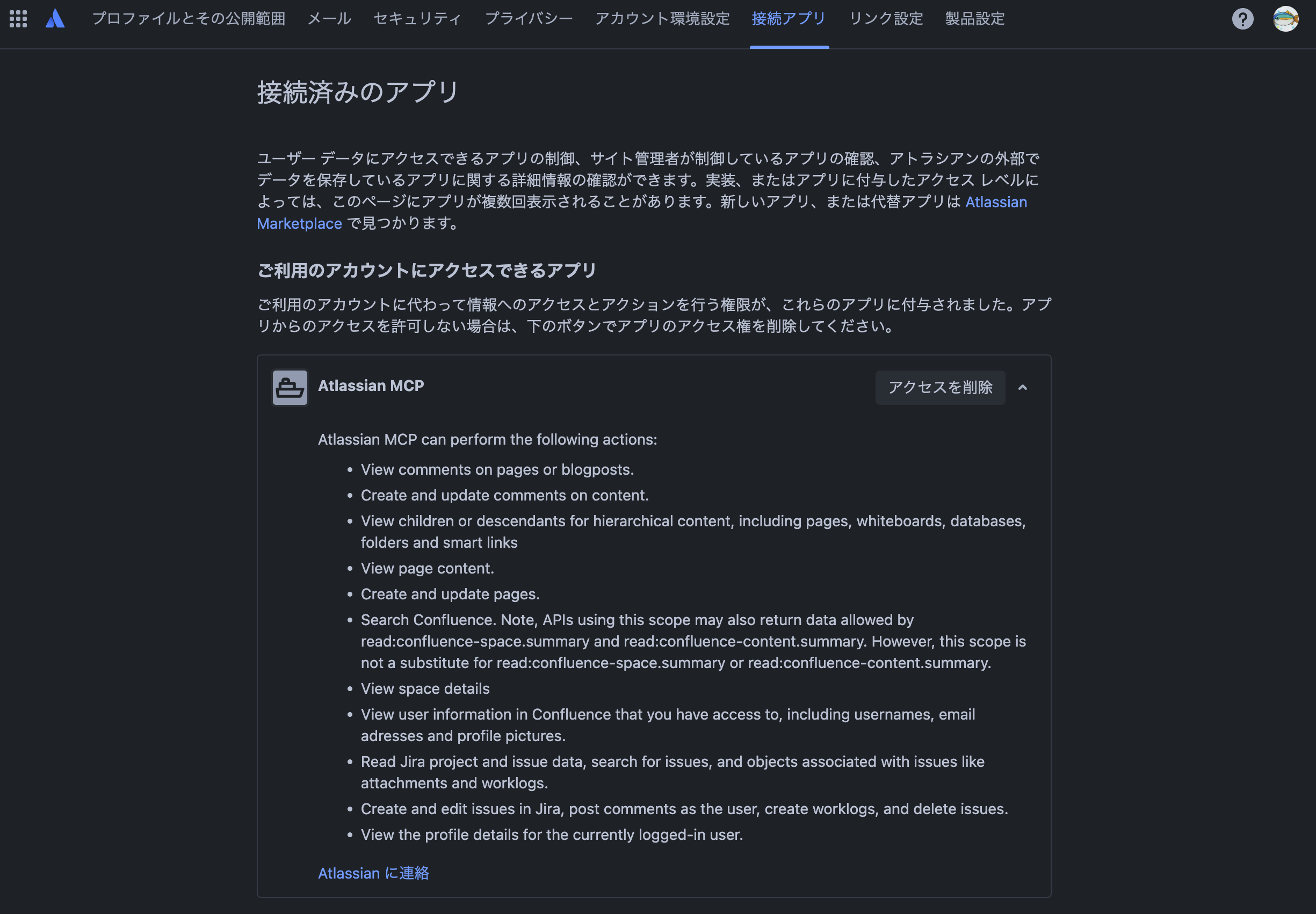 アカウントで許可したアプリのアクセス権限はアカウント設定から確認できる。
