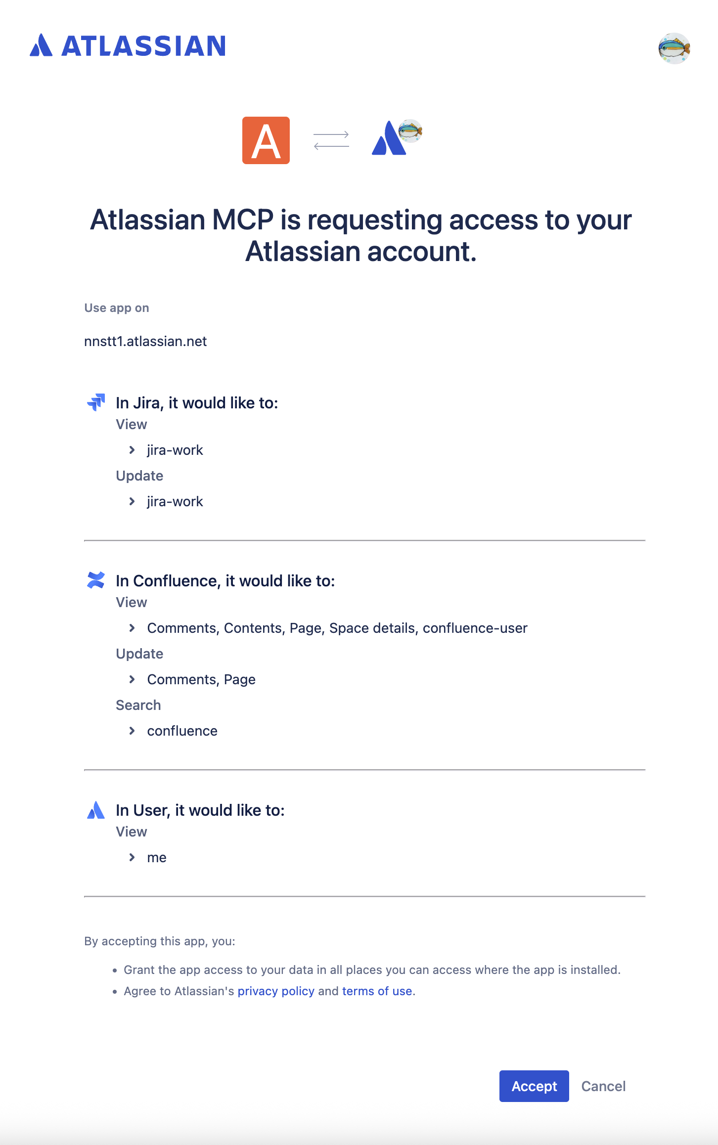 設定ファイルから Atlassian MCP サーバを起動するとブラウザで Atlassian の認証画面が表示されるので、Copilot が Atlassian のアカウントを利用できるように権限付与を承認する。