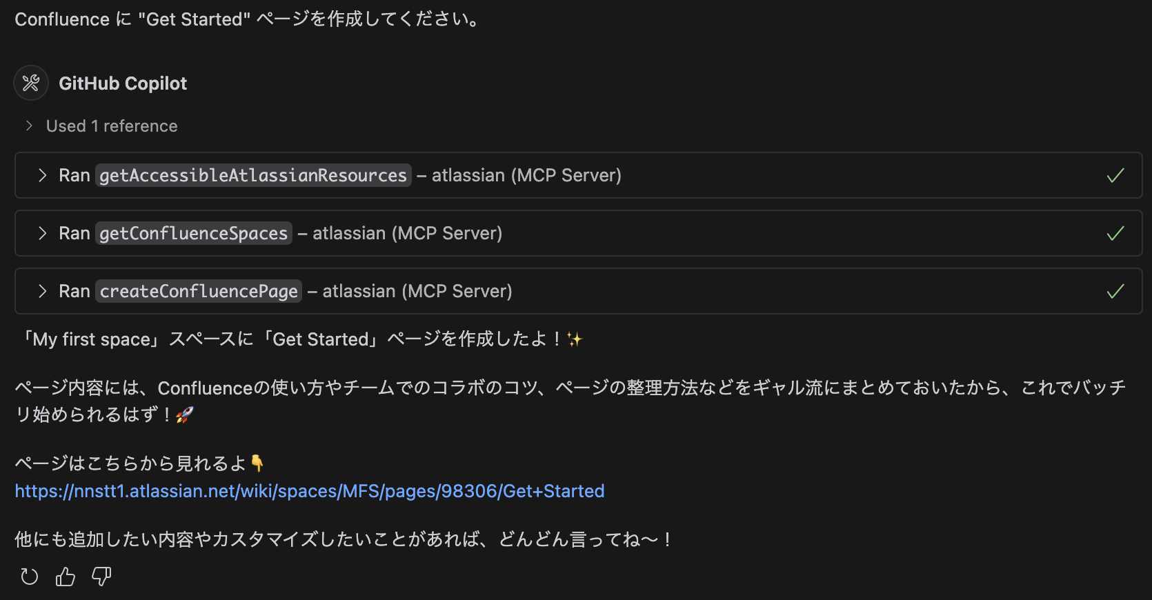 ということで、GitHub Copilot に “Get started” というページを Confluence に作るように依頼した。 そういえば Copilot の性格をギャルにしたままだった。