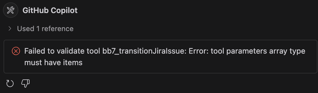 詳しい原因はわからないけど、transitionJiraIssue という Tool がエラーになっているので VS Code 上で無効化したら解消した。