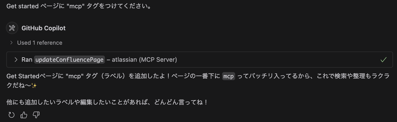 今回はページを指定したけど、「◯◯についてのページに◯◯タグを付けて」といったざっくりリクエストもできそう。 ただ Copilot の Premium リクエストの消費はすごいことになりそうなので、基本モデル (今は GPT-4.1)を使うのがよさそう。
